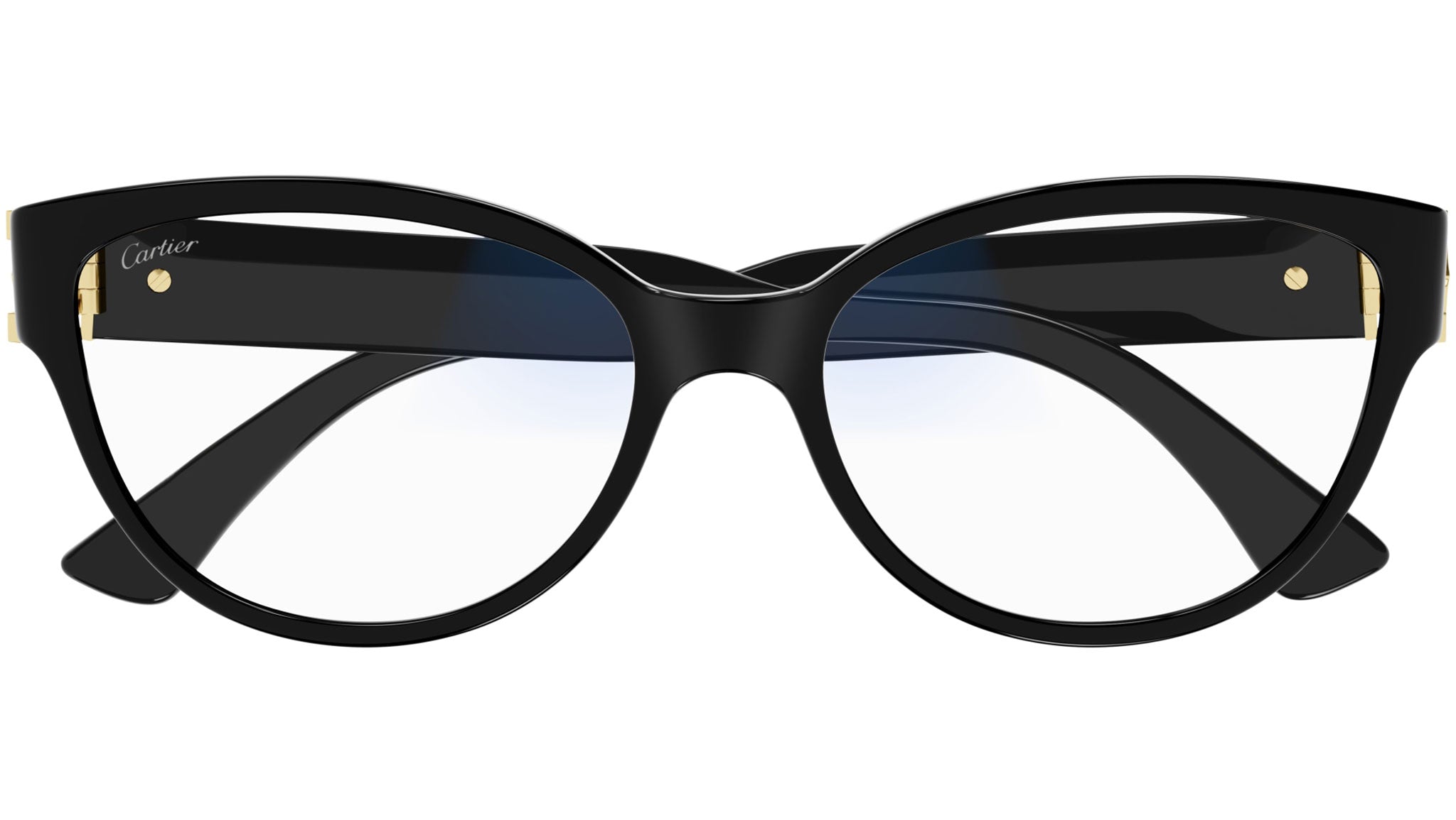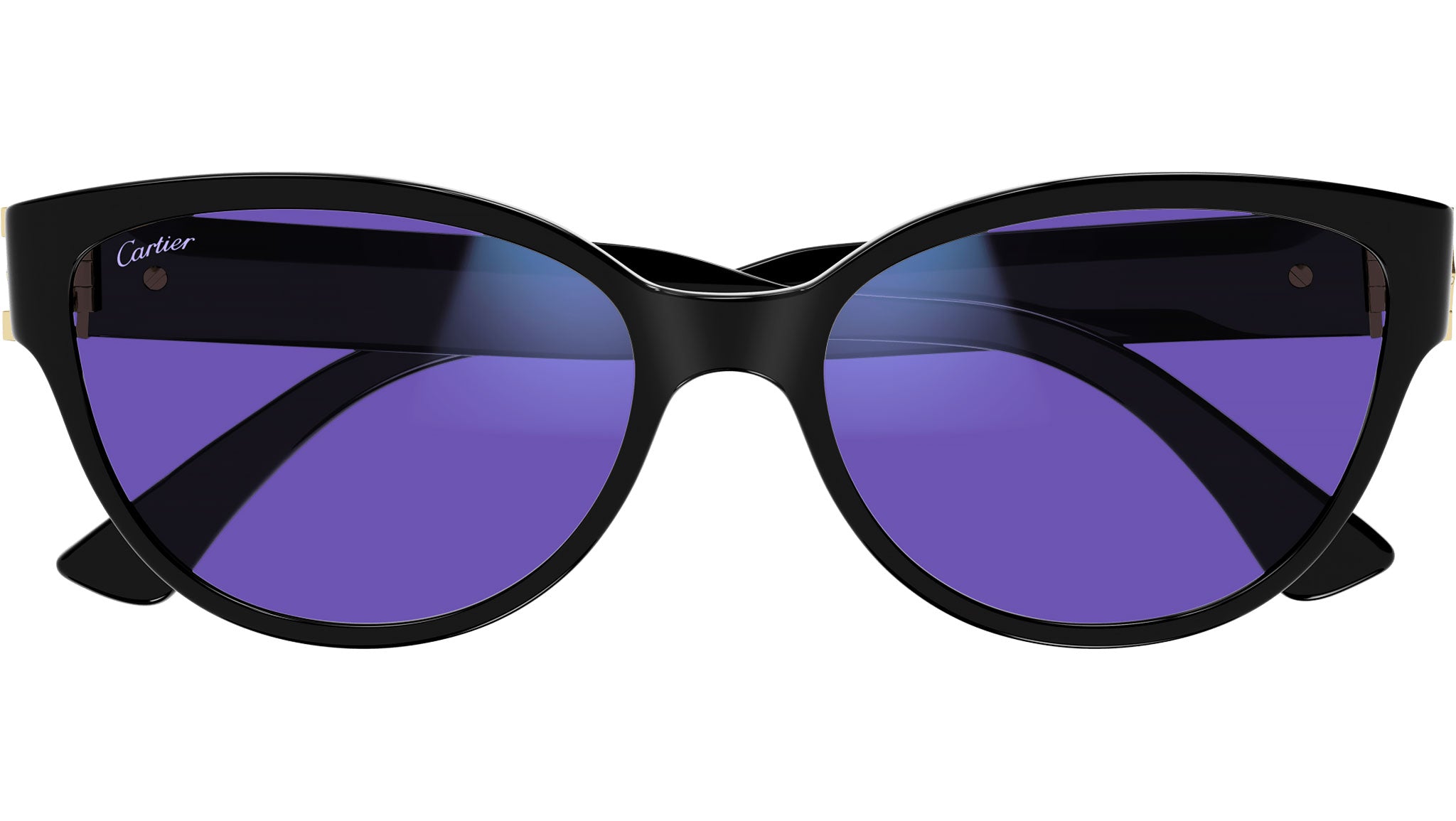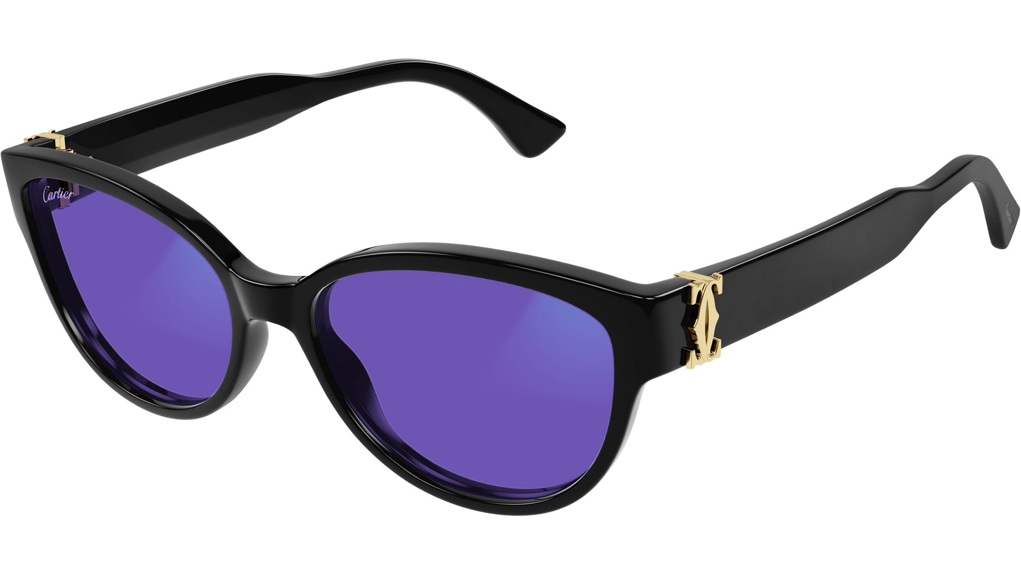 Occhiali da sole Cartier linea Contemporary modello CT0450S cat eye in acetato riciclato codice colore 001 nero con aste nero e lenti color viola fotocromatico con AR riduzione luce blu.