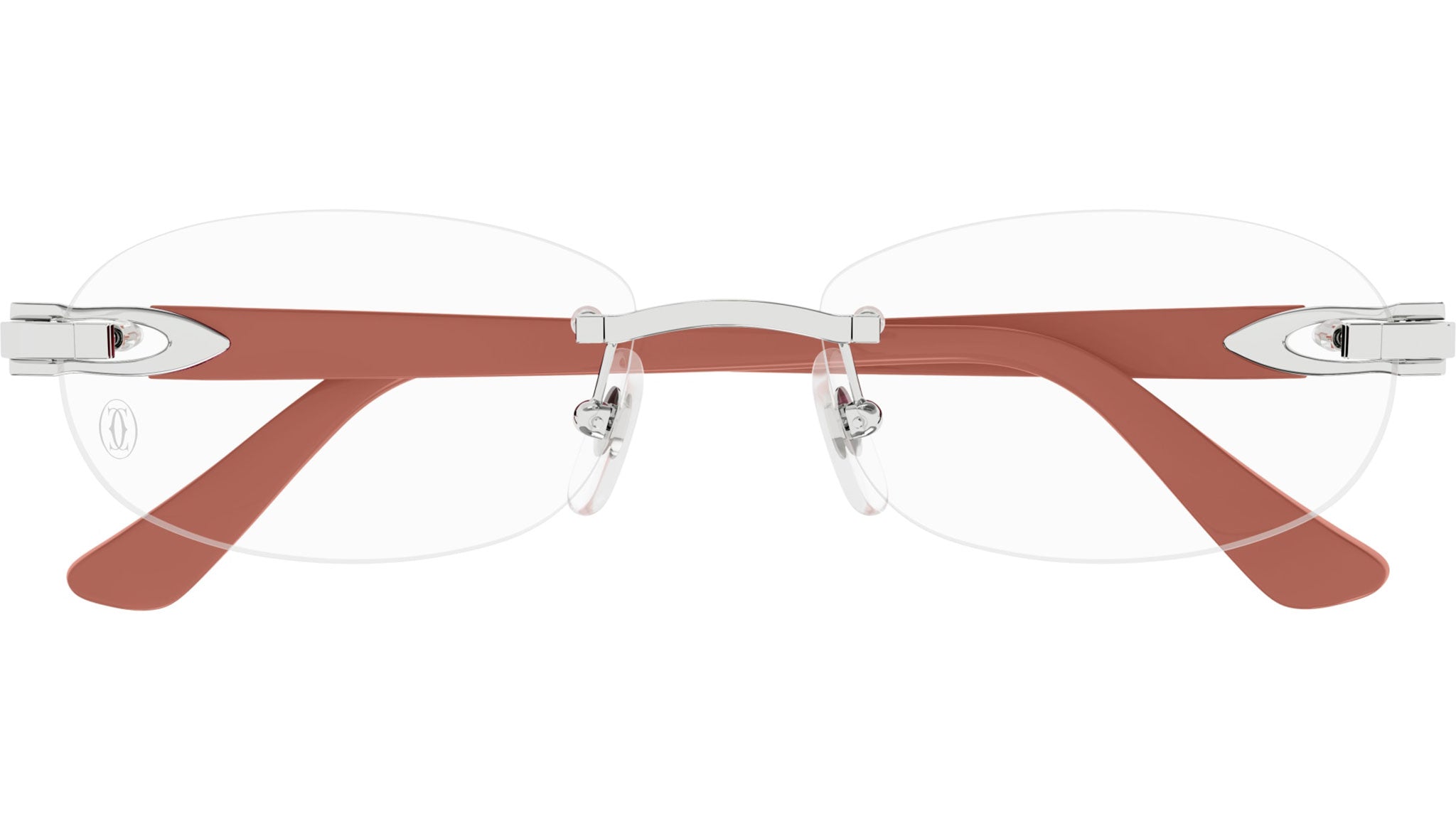 Occhiali da vista Cartier Core Range modello CT0455OJ panthos in metallo codice colore 002 finish platino levigato con aste rosa e lenti demo da materiale riciclato con strato HR e filtro AR blu.