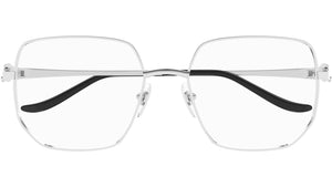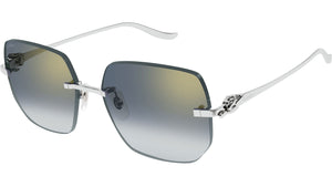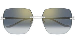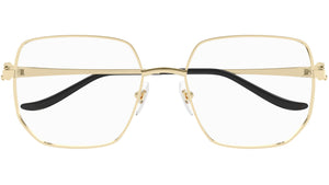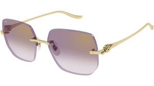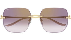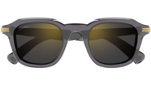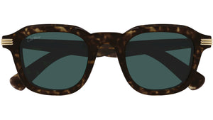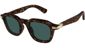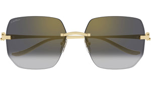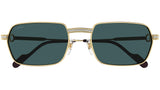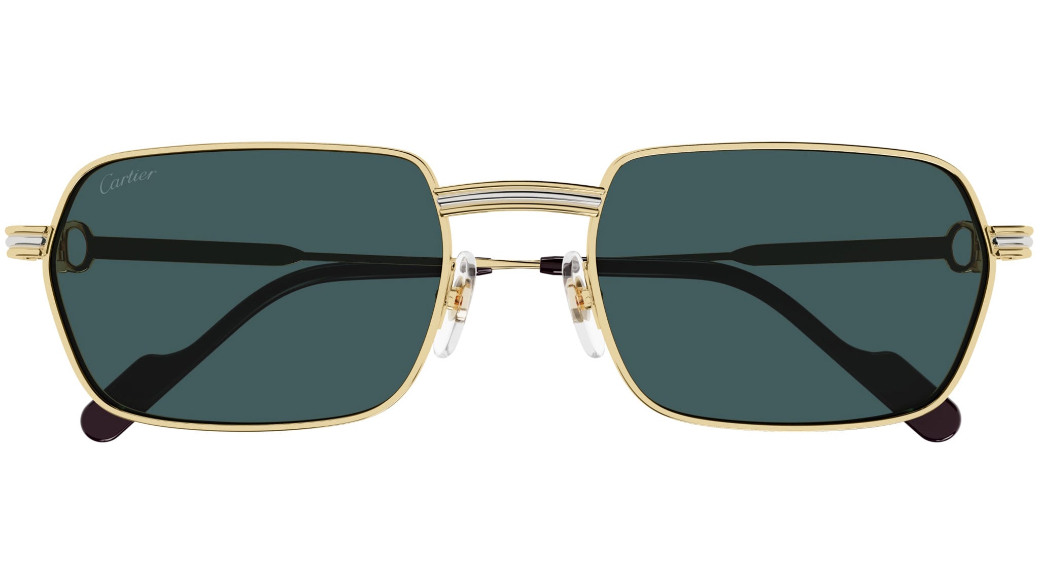 Occhiali da sole Cartier linea Core Range modello CT0463S rectangle in metallo codice colore 002 finitura oro e platino levigato con aste oro e lenti color verde.