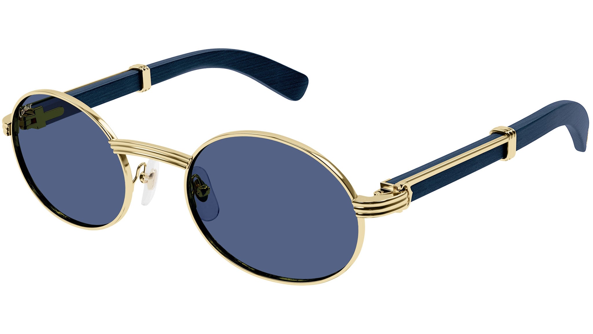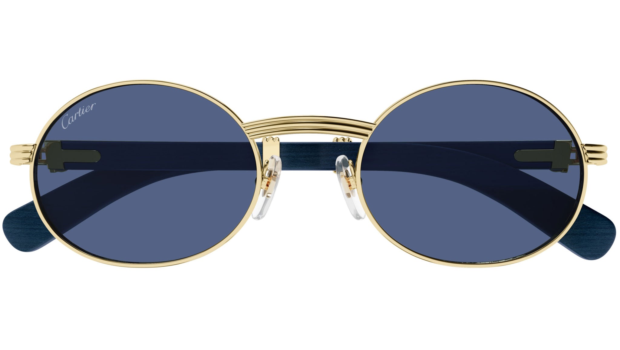 Occhiali da sole Cartier linea Exception modello CT0464S panthos in metallo codice colore 004 oro finitura smooth con aste blu e lenti color blu.
