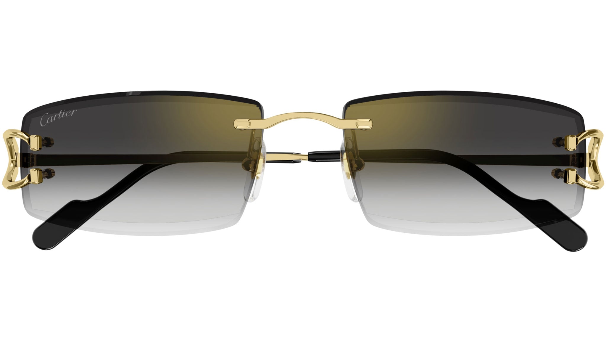 Occhiali da sole Cartier linea Core Range modello CT0465S rectangle in metallo codice colore 001 oro finitura smooth con aste oro e lenti color grigio sfumato con flash dorato.