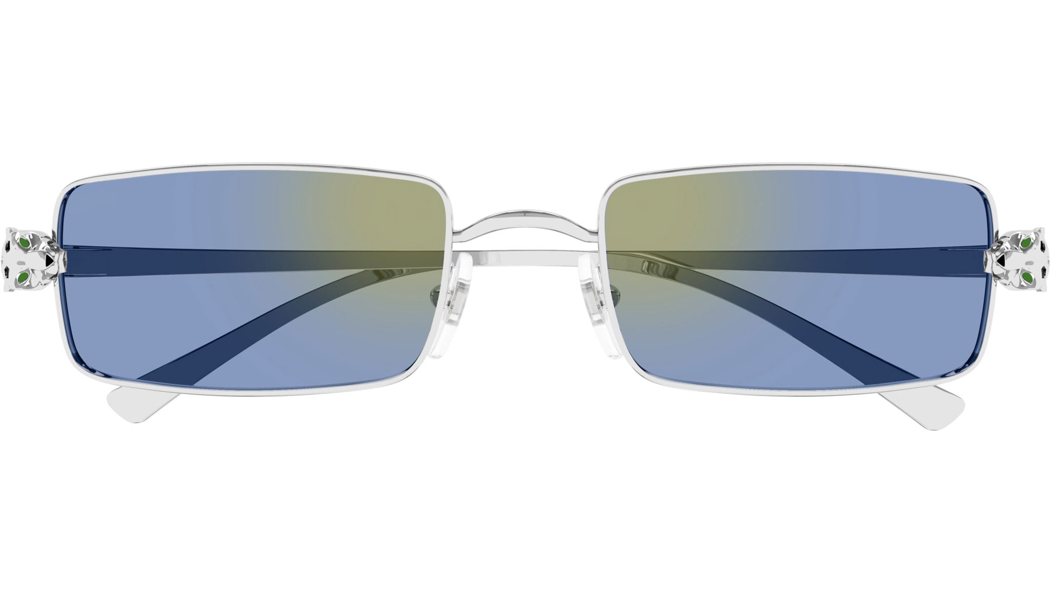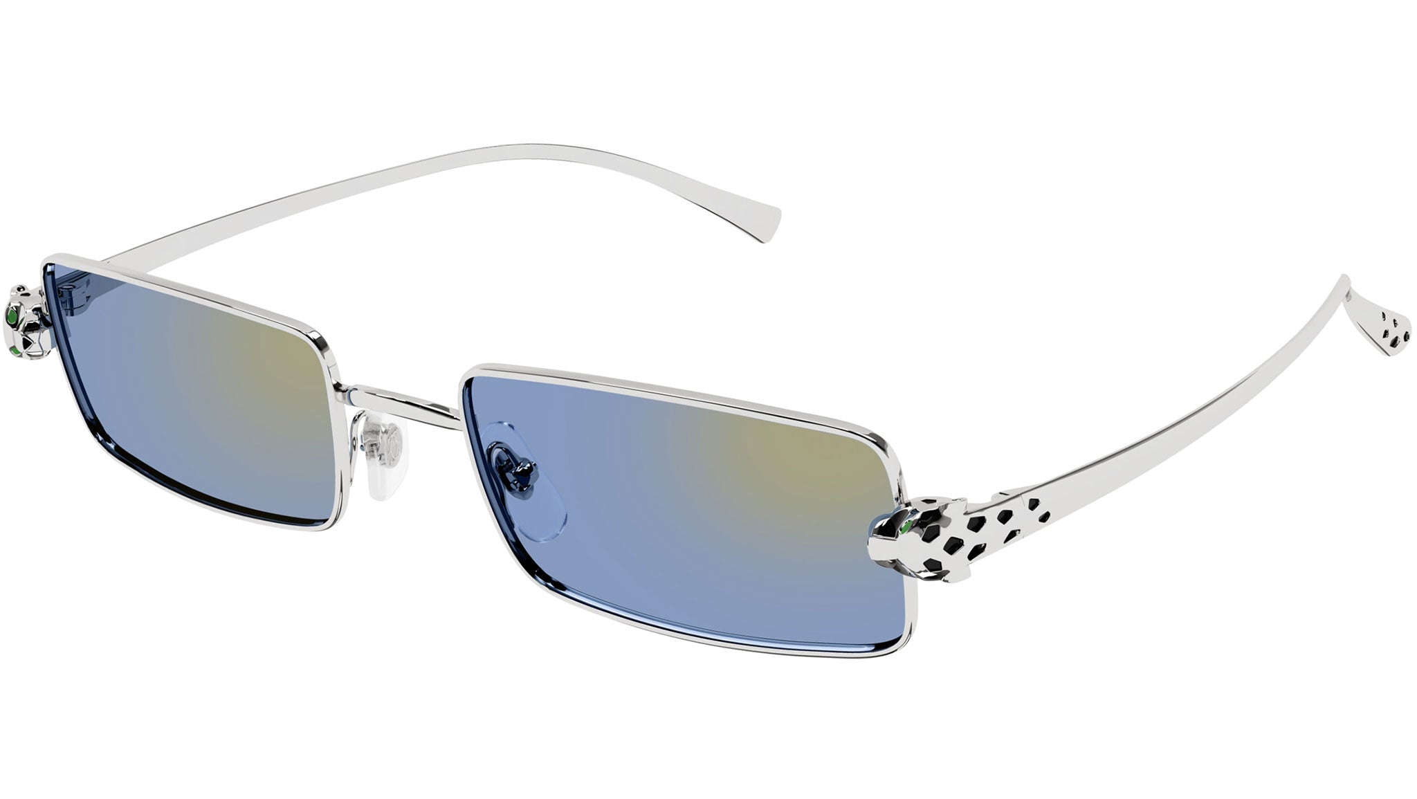 Occhiali da sole Cartier linea Exception modello CT0473S rectangle in metallo codice colore 004 finish platino levigato con aste argento e lenti color azzurro con flash oro.