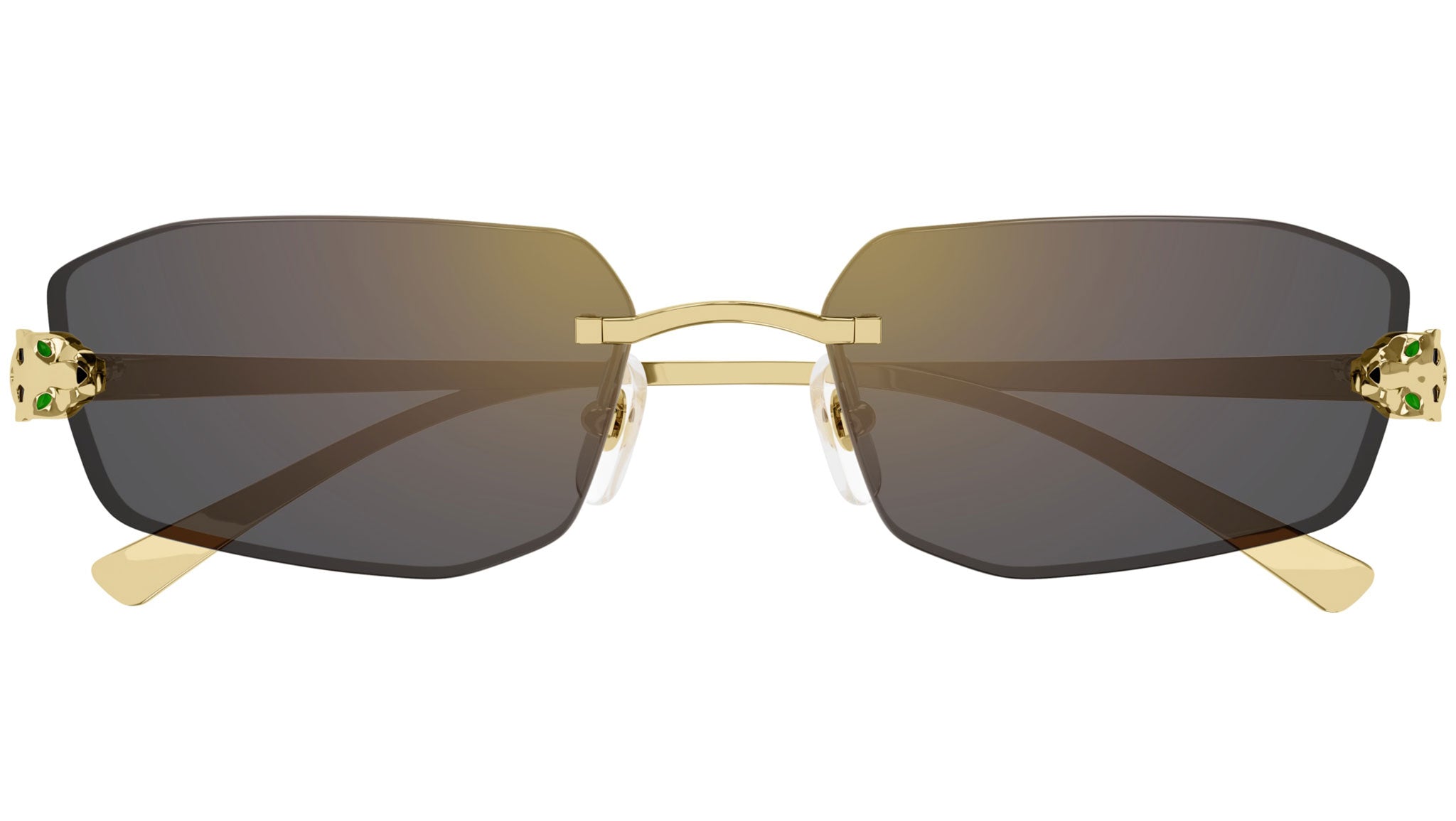 Occhiali da sole Cartier linea Exception modello CT0474S geometric in metallo codice colore 001 oro finitura smooth con aste oro e lenti color grigio con flash oro.