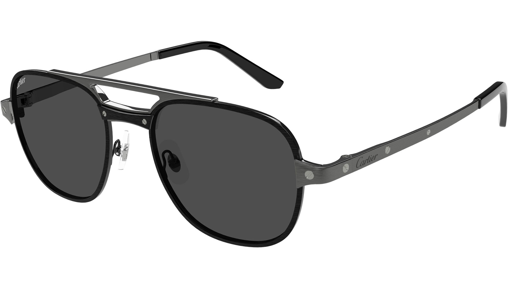 Occhiali da sole Cartier linea Exception modello CT0477S in metallo aviatore codice colore 002 finitura pvd nero spazzolato e spazzolato con aste color rutenio e lenti color ultra nero polarizzato.