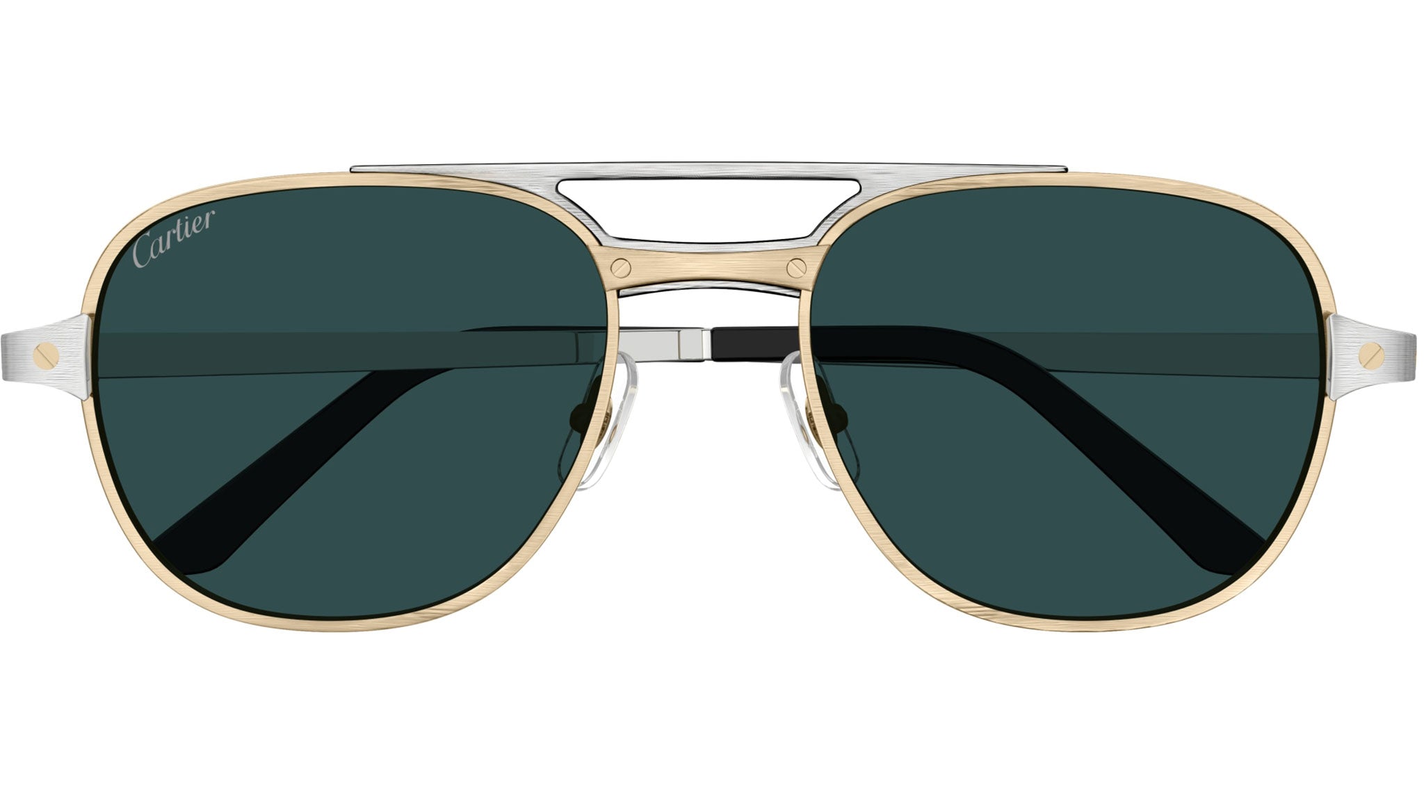 Occhiali da sole Cartier linea Exception modello CT0477S in metallo aviatore codice colore 003 finitura oro spazzolato e finitura platino spazzolato con aste color argento e lenti color verde.