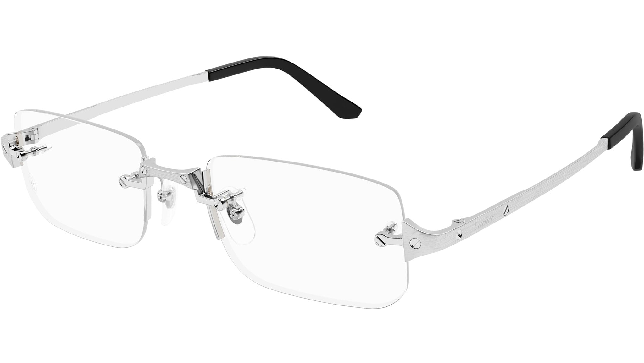 Occhiali da vista Cartier Core Range modello CT0479O rectangle in metallo codice colore 002 finitura platino levigato spazzolato con aste argento e lenti demo da materiale riciclato con strato HR e filtro AR blu.