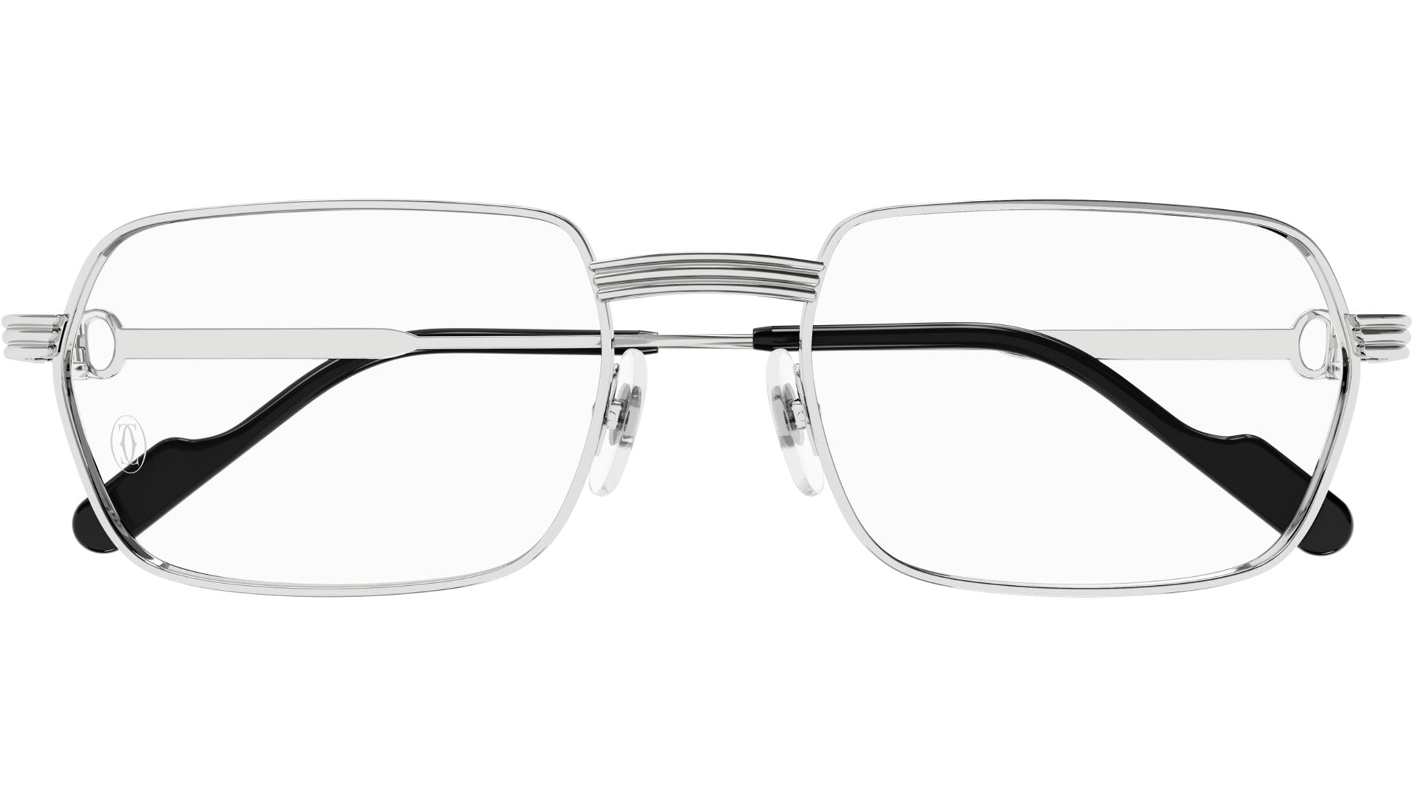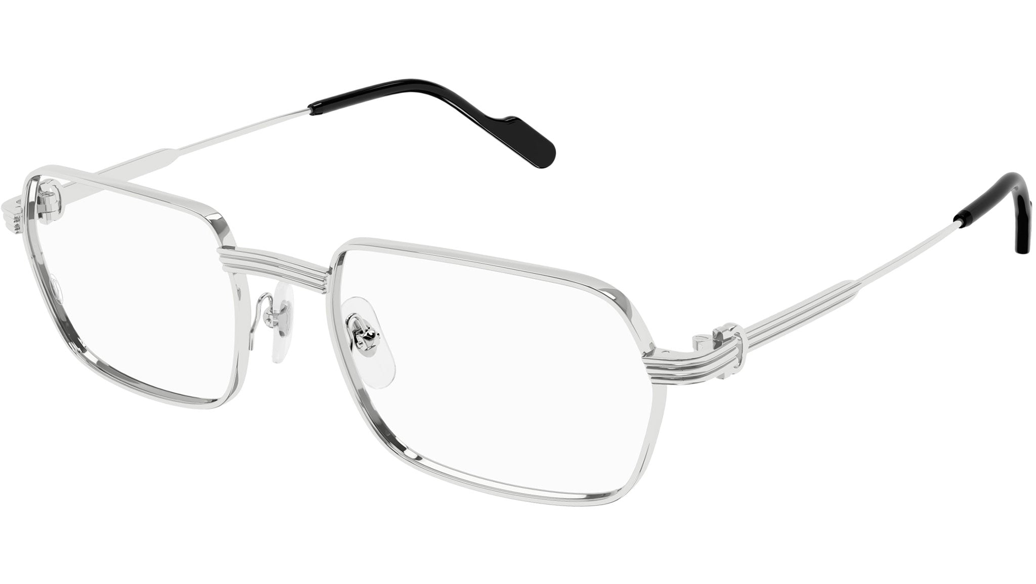 Occhiali da vista Cartier Core Range modello CT0483O rectangle in metallo codice colore 002 finish platino levigato con aste argento e lenti demo da materiale riciclato con strato HR e filtro AR blu.