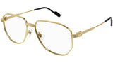 Occhiali da vista Cartier Core Range modello CT0484O aviator in metallo codice colore 001 oro finitura smooth con aste oro e lenti demo da materiale riciclato con strato HR e filtro AR blu.