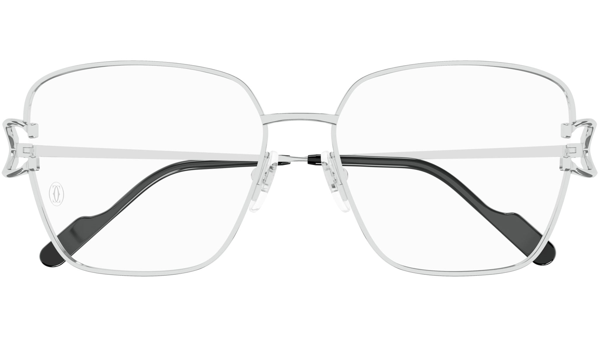 Occhiali da vista Cartier Core Range modello CT0486O cat eye in metallo codice colore 002 finish platino levigato con aste argento e lenti demo da materiale riciclato con strato HR e filtro AR blu.