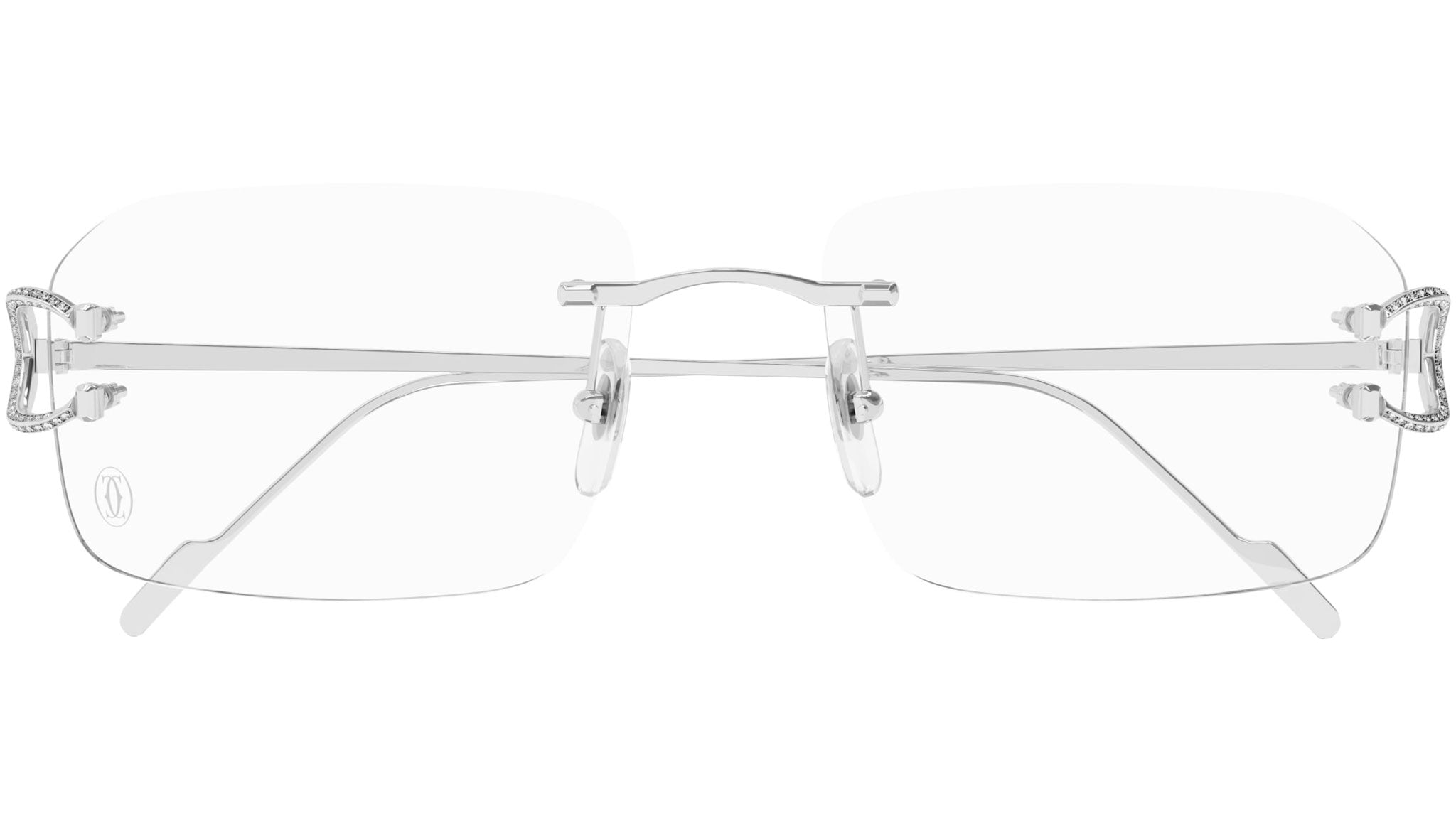 Occhiali da vista Cartier Precious modello CT0489O rectangle in oro codice colore 003 oro bianco tinta unita con aste argento e lenti demo da materiale riciclato con strato HR e filtro AR blu.