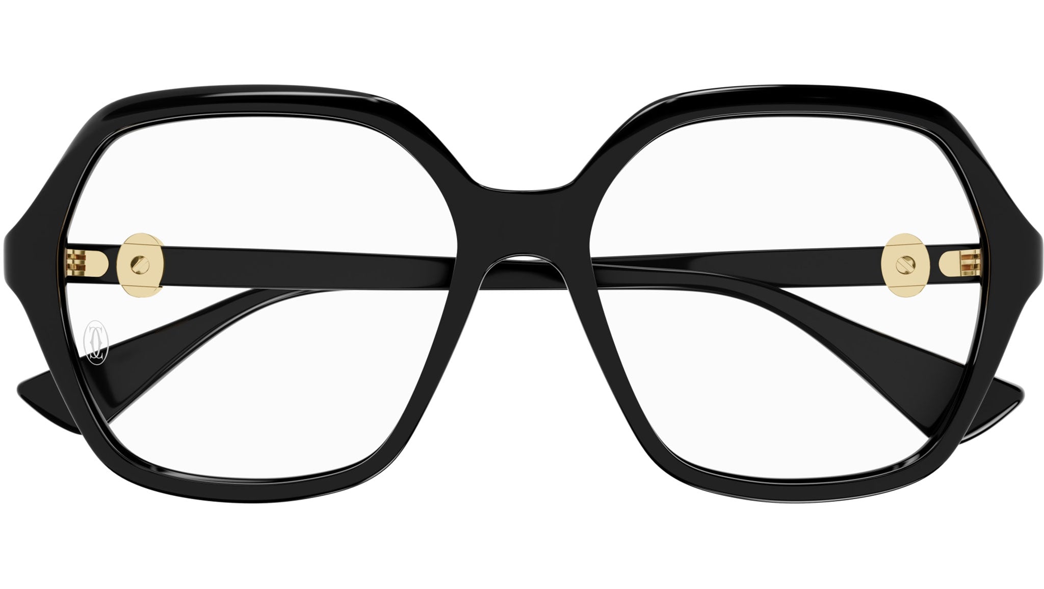 Occhiali da vista Cartier Contemporary modello CT0492O rectangle in acetato riciclato codice colore 001 nero con aste nero e lenti demo da materiale riciclato con strato HR e filtro AR blu.
