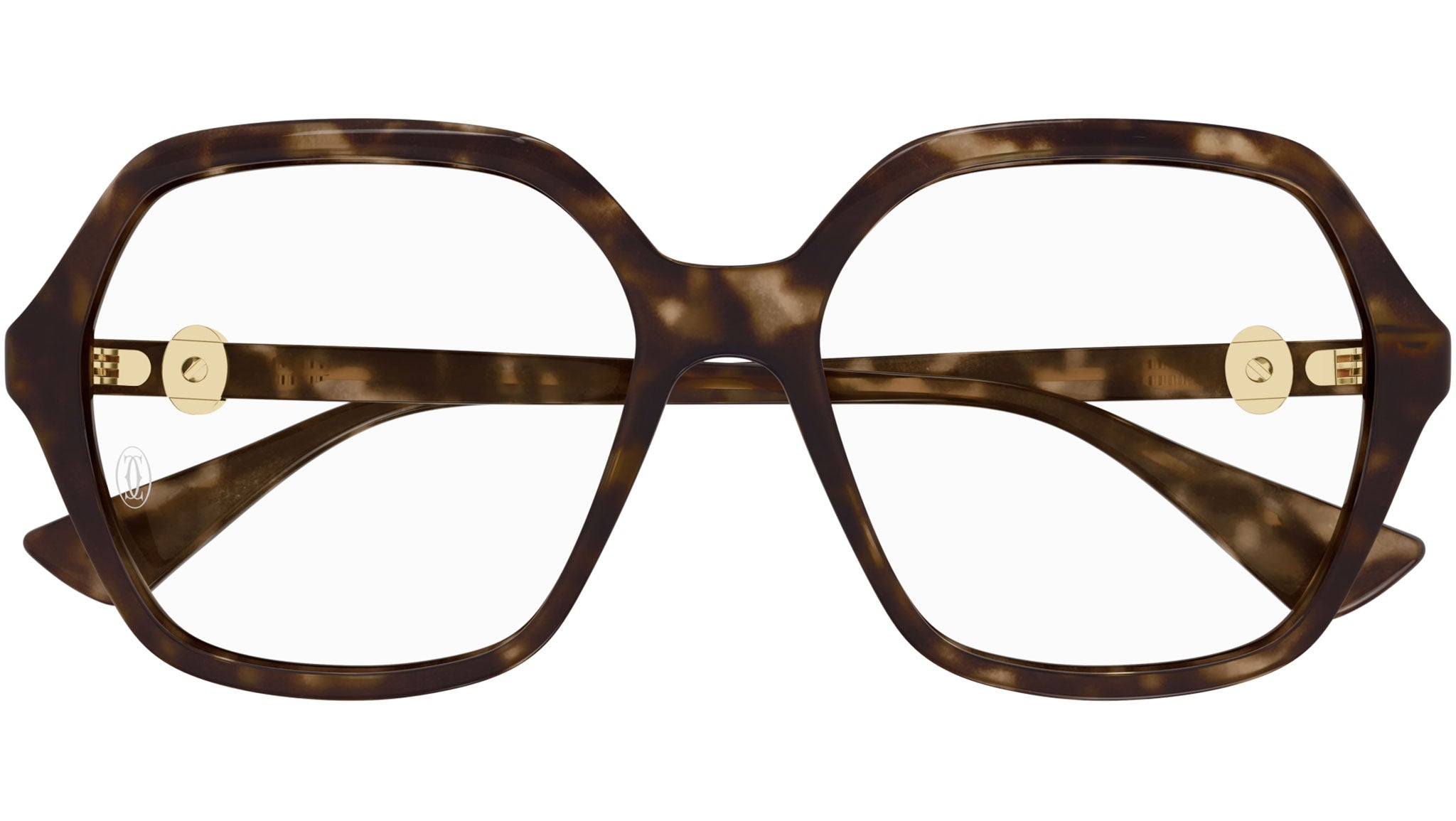 Occhiali da vista Cartier Contemporary modello CT0492O rectangle in acetato riciclato codice colore 002 tartaruga scuro con aste tartaruga e lenti demo da materiale riciclato con strato HR e filtro AR blu.