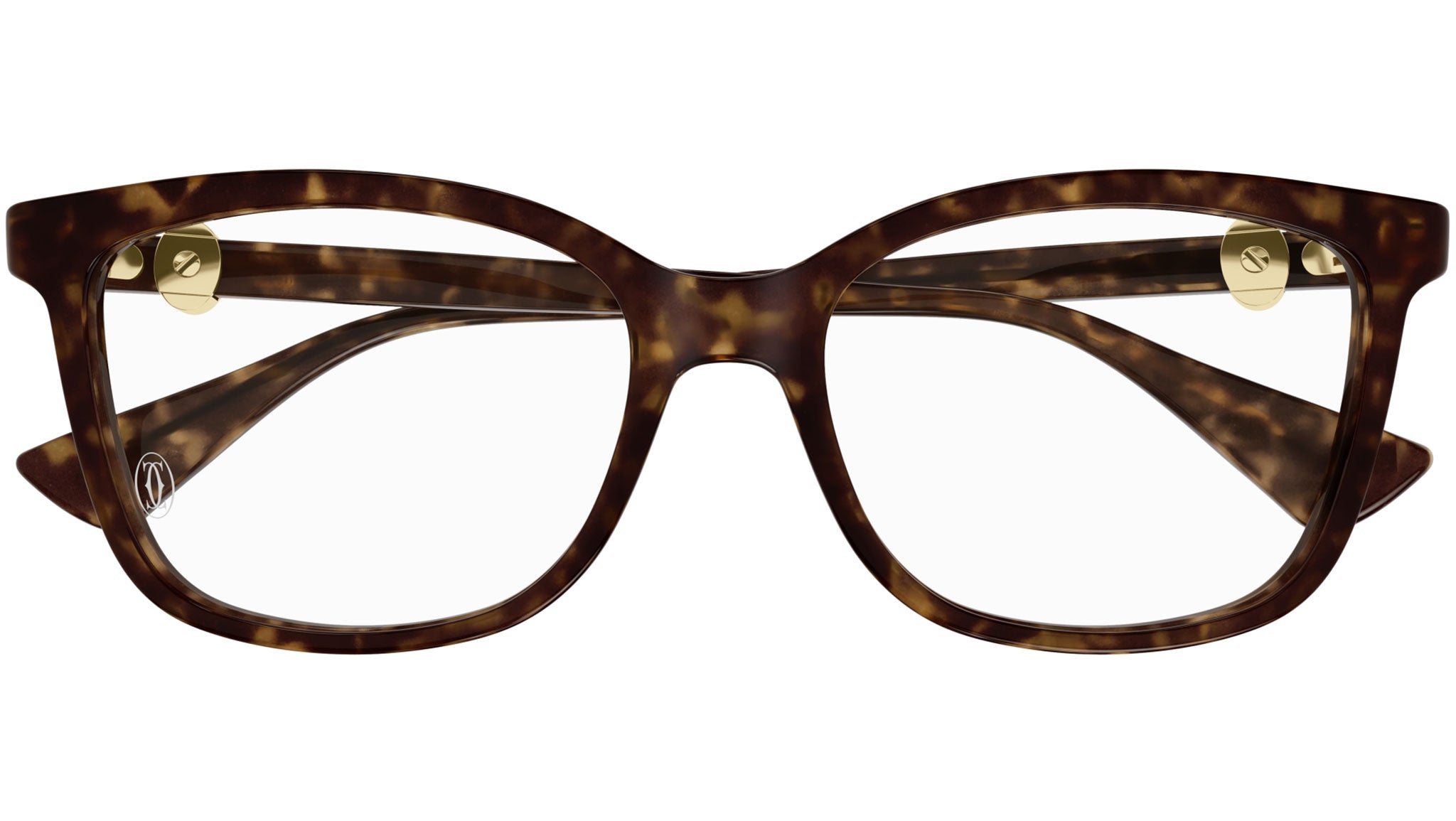 Occhiali da vista Cartier Contemporary modello CT0493O rectangle in acetato riciclato codice colore 002 tartaruga scuro con aste tartaruga e lenti demo da materiale riciclato con strato HR e filtro AR blu.