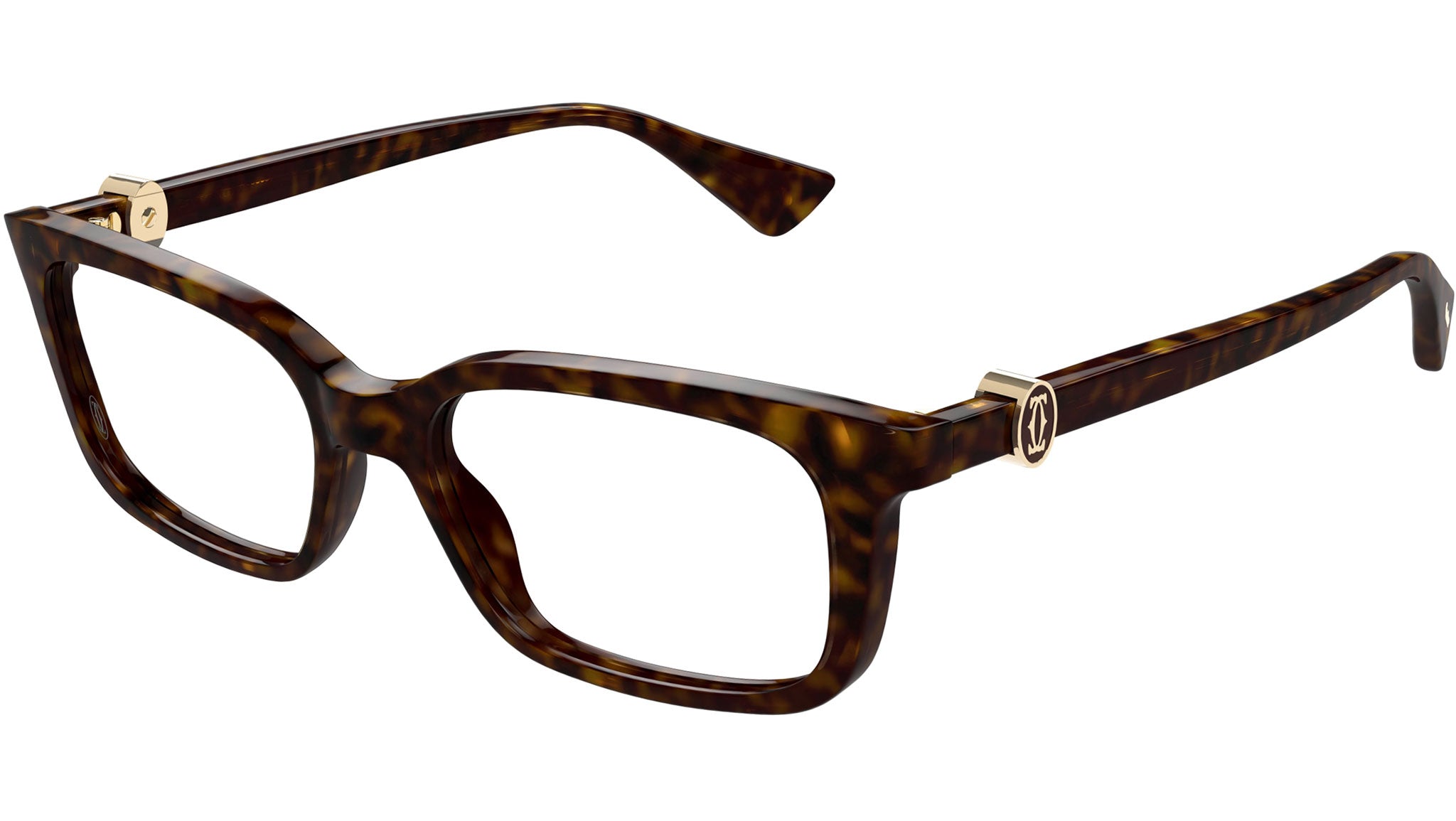 Occhiali da vista Cartier linea Contemporary modello CT0525O in acetato riciclato rettangolare colore tartaruga scuro con asta tartaruga e lenti demo da materiale riciclato con strato HR e filtro AR blu.