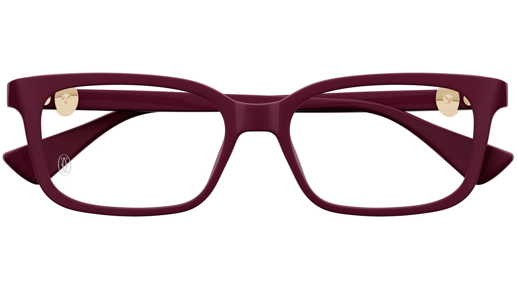 Occhiali da vista Cartier linea Contemporary modello CT0525O in acetato riciclato rettangolare colore rosso borgogna con asta rosso borgogna e lenti demo da materiale riciclato con strato HR e filtro AR blu.