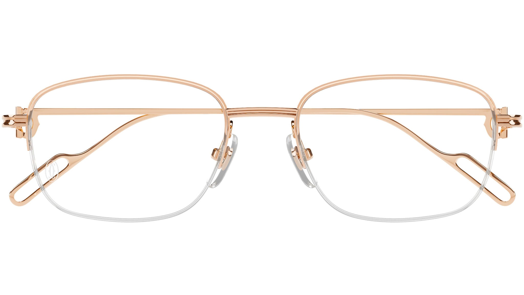 Occhiali da vista Cartier linea Precious modello CT0529OA in oro rettangolare codice colore 001 oro rosa tinta unita con asta rame e lenti demo da materiale riciclato con strato HR e filtro AR blu.