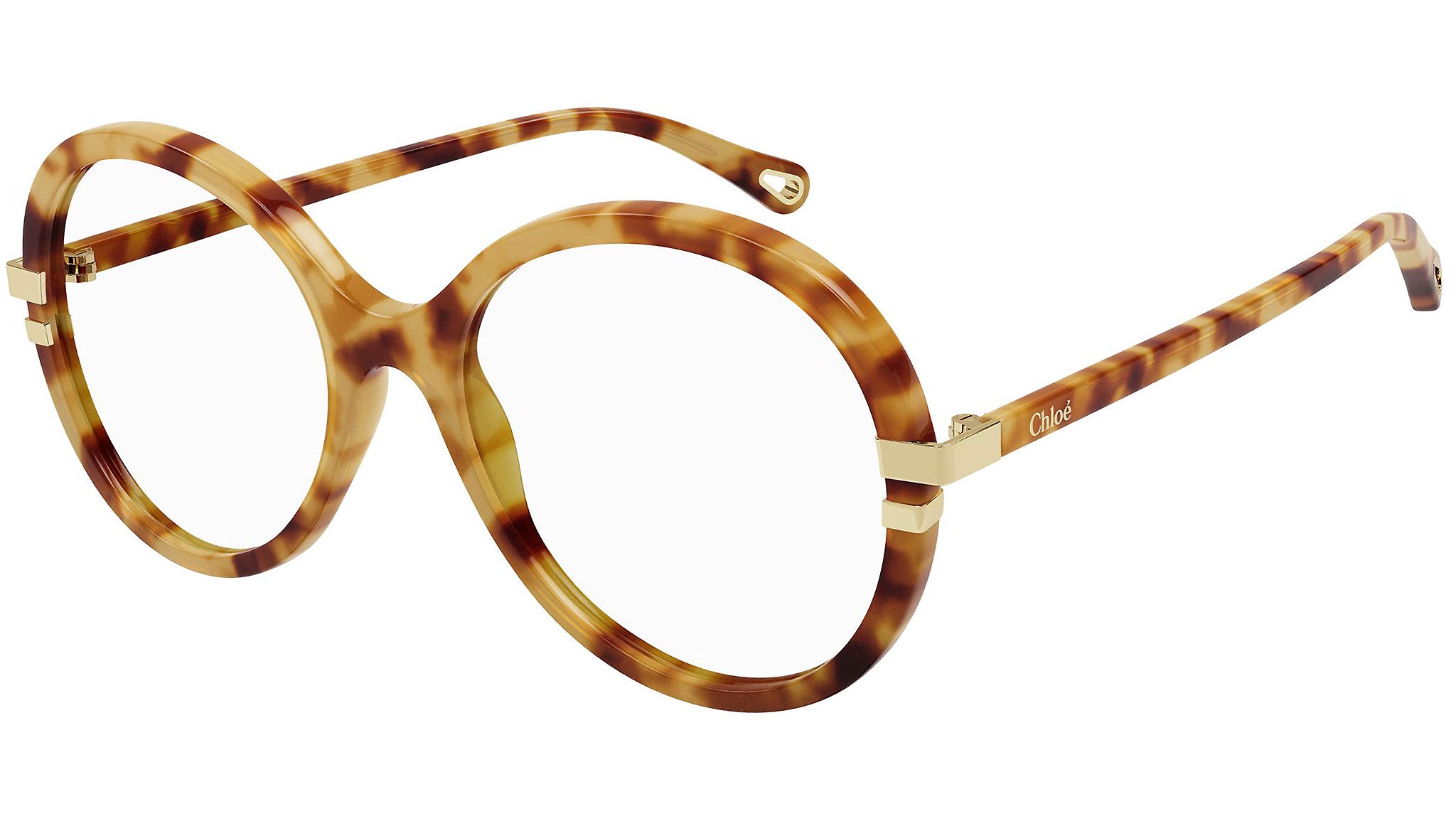 Occhiali da vista Chloé modello 0108O, variante colore 004 avana chiaro lucido con astine color tartaruga.