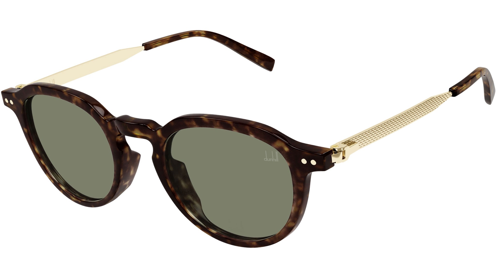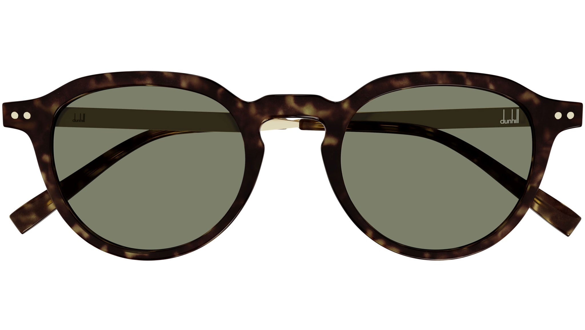 Occhiali da sole Dunhill modello DU0091S linea Eyewear forma panto in acetato riciclato, codice colore 003 tartaruga scuro lucido con aste color oro e lenti color grigio tinta unita.