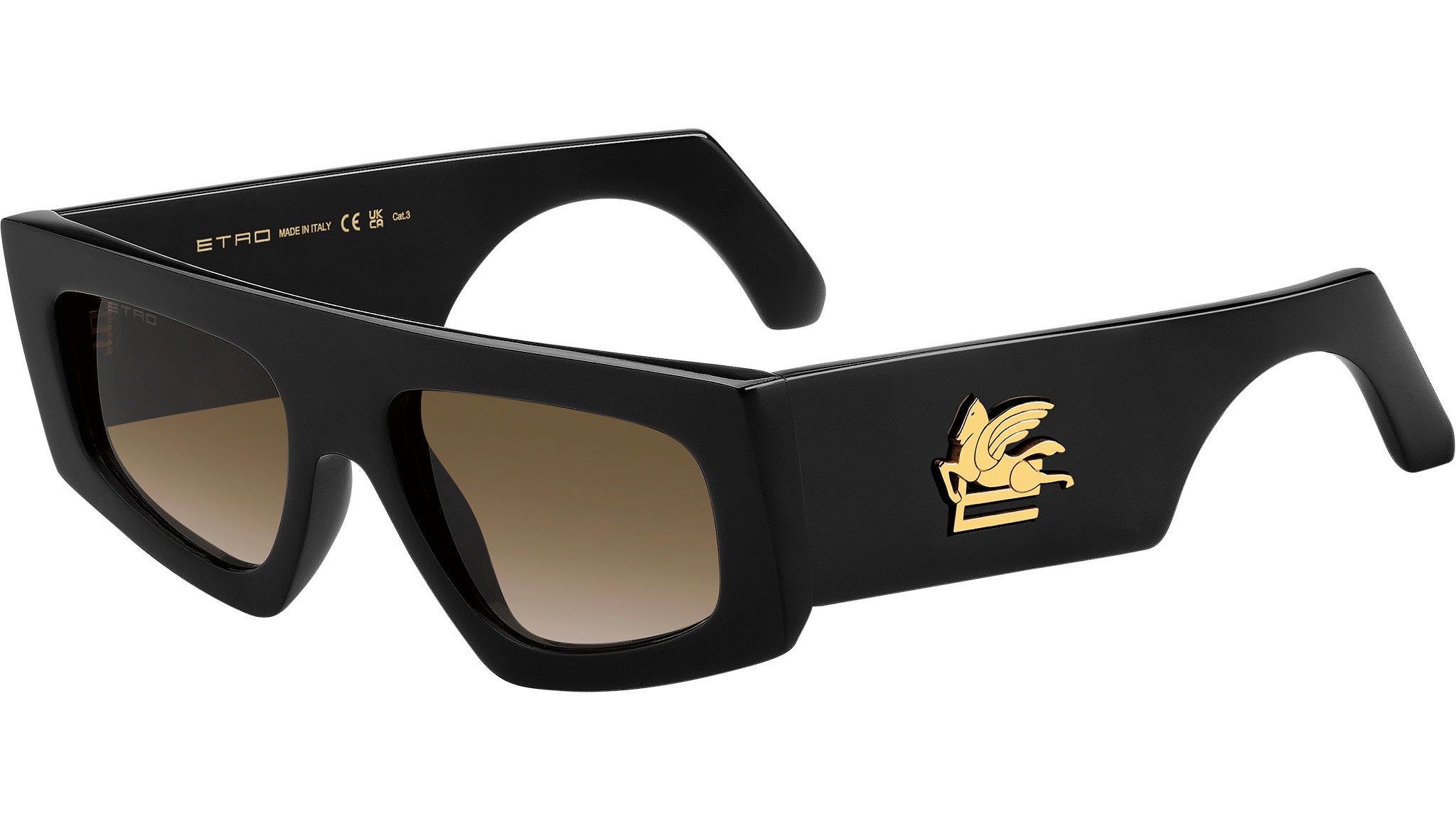 Occhiali da sole ETRO modello 0032/G/S codice colore 807 HA in Injected nero con lenti in CR-39 marrone sfumato. La collezione di occhiali "Etroscreen" richiama l'eleganza distintiva della fashion house ETRO attraverso un design originale, dal forte impatto visivo. I volumi decisi di questi occhiali da sole genderless sono esaltati dall'abbinamento monocromatico della montatura e delle lenti. Elementi heritage sottolineano l'unicità della montatura: le aste dalla forma ampia e geometrica sono rifinite con il logo Pegaso dorato o tono su tono, mentre i terminali richiamano le linee simmetriche del logo del ETRO. Il tocco finale è il nome del brand inciso al laser sulle lenti. Rivenditore autorizzato online Dsquared2.