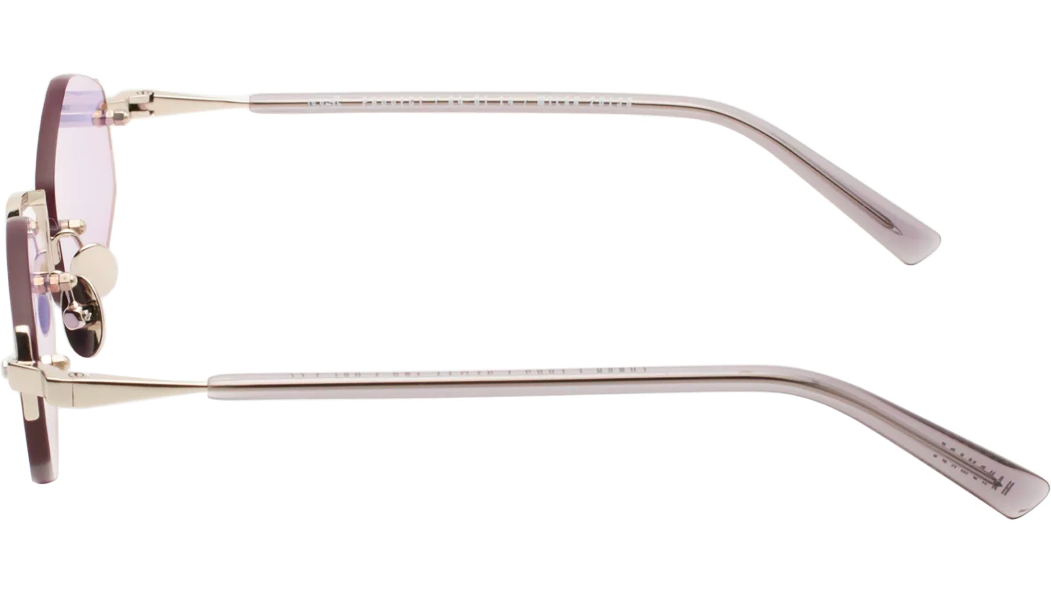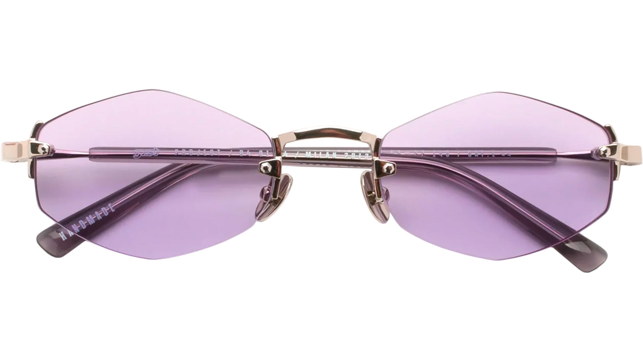 Occhiali da sole con montatura in metallo artigianale di colore argento e lenti viola chiaro. Materiale del telaio: metallo. Forma del telaio: geometrici. Cerniere metalliche a cinque barre e nucleo in filo personalizzato. Custodia rigida premium e panno per la pulizia in microfibra.
