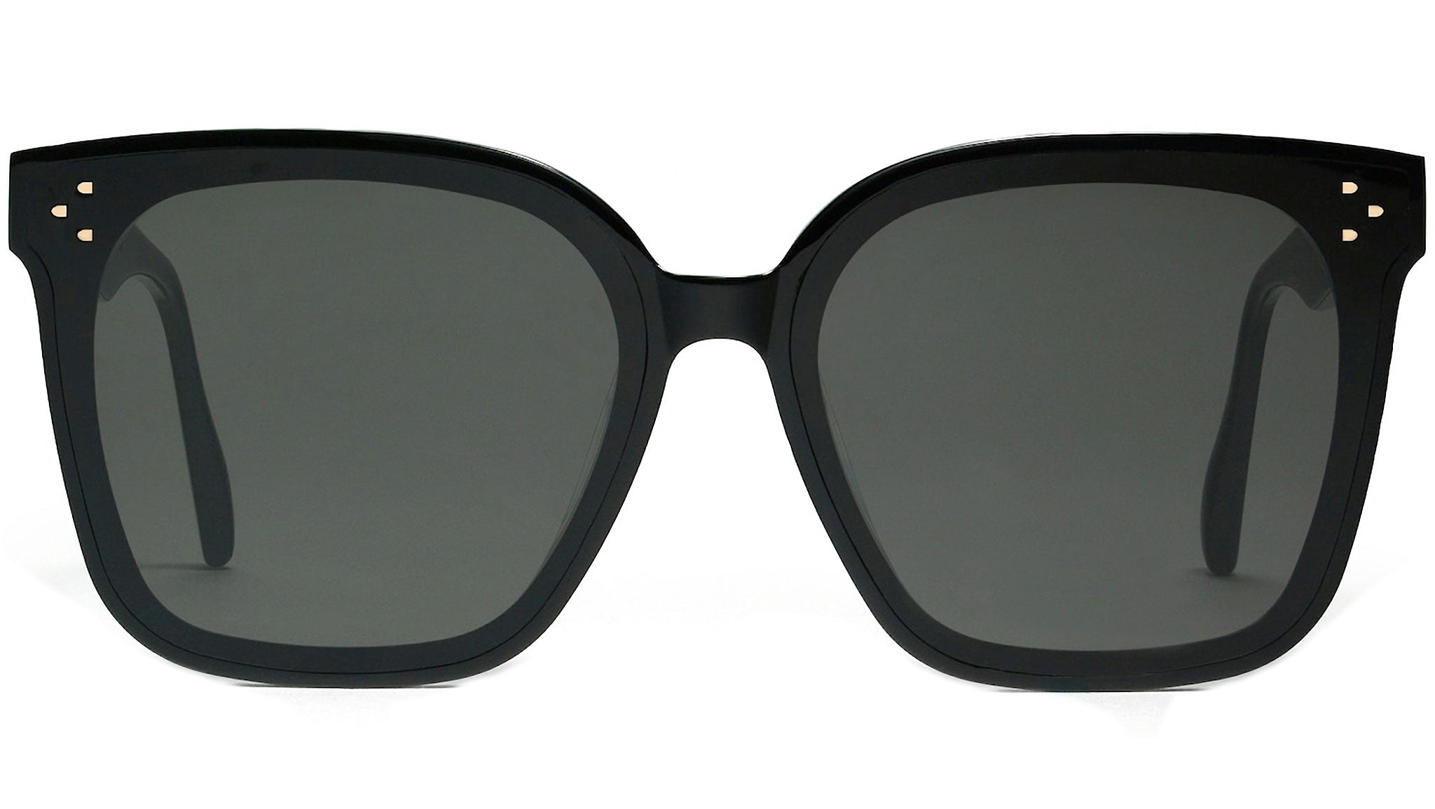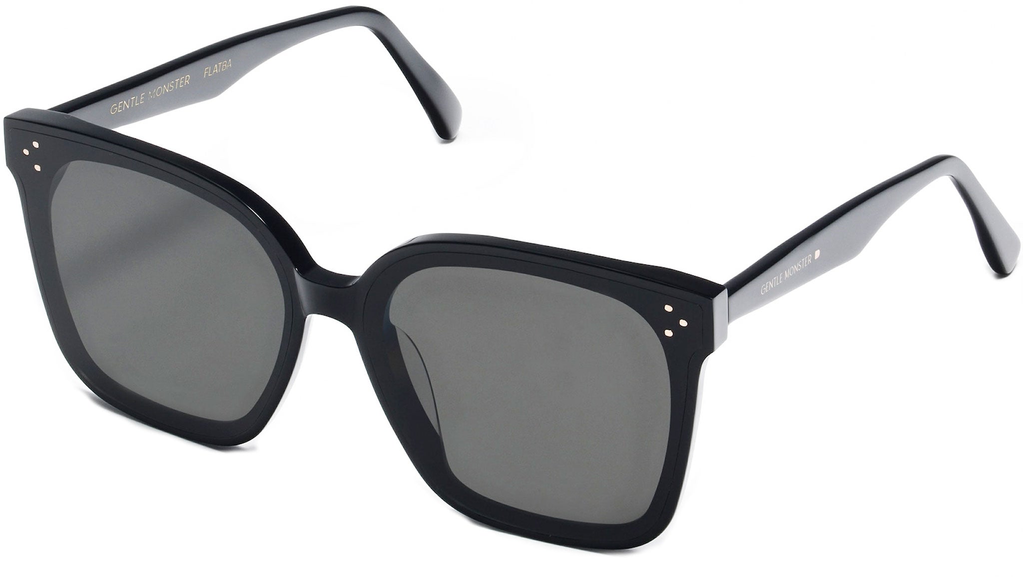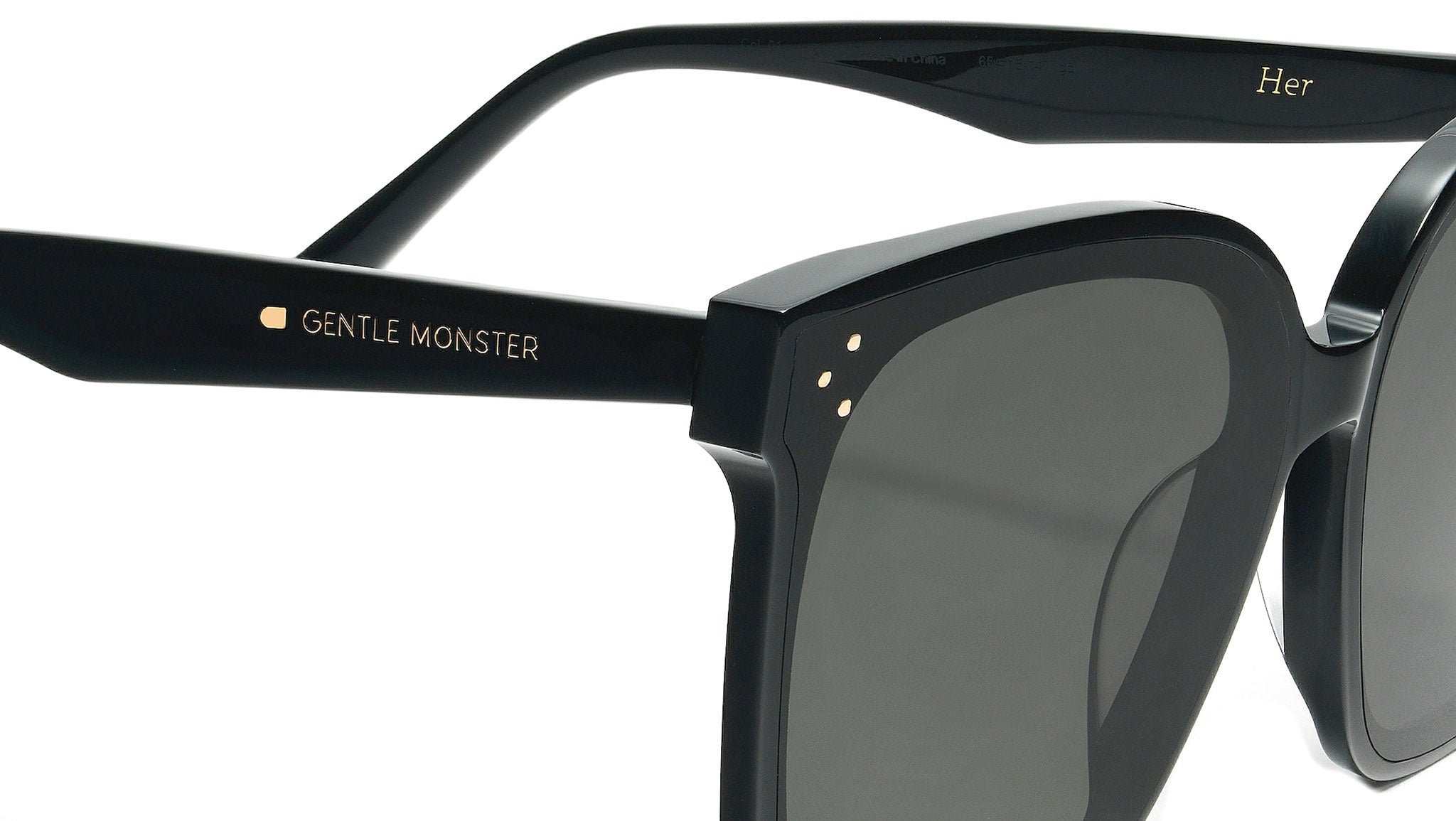 Introducing Her 01, an oversized square frame in the New Flatba Series with 99.9% UV protected nylon Zeiss lenses. This style is accentuated with three rose gold bullet shaped pins on the lenses and complemented with engraved Gentle Monster logos on the temples. Bullet shaped pin details. Oversized square Flatba frame. Frame Front: 148.2mm, Frame Side: 147mm. Lens Width: 65.3mm, Lens Height: 55.8mm. Bridge: 15mm. Country of Manufacturer: China.