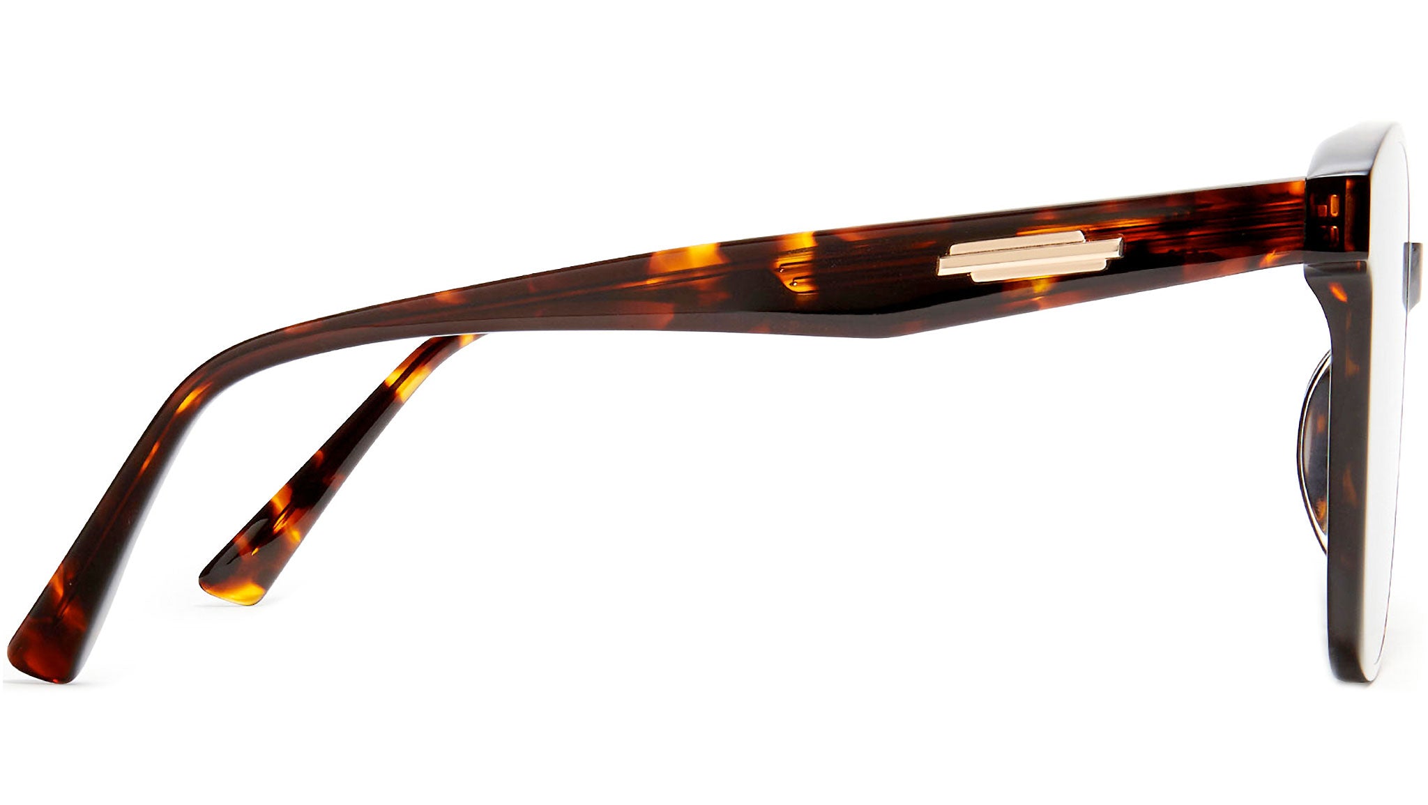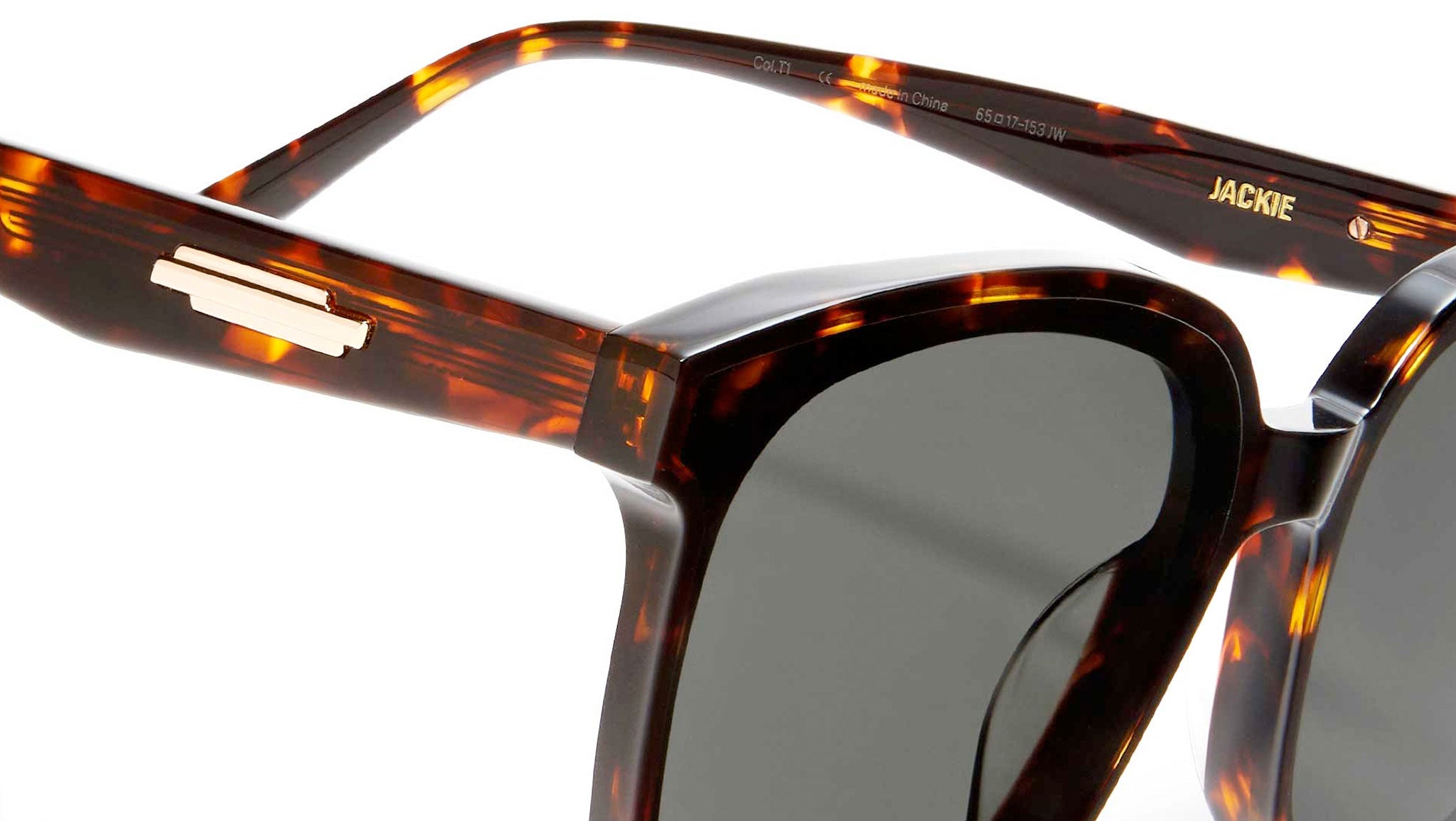 Jackie T1 is a brown tortoise acetate Flatba frame with 99.9% UV protected black Zeiss lenses. This versatile design with soft curves and temples decorated with unique metal details is designed to fit any occasion. Square Flatba frame. Oversized acetate frame. Metal details on temples. Frame Front: 148.7mm, Frame Side: 152.6mm. Lens Width: 54.8mm, Lens Height: 64.5mm. Country of Manufacturer: China.