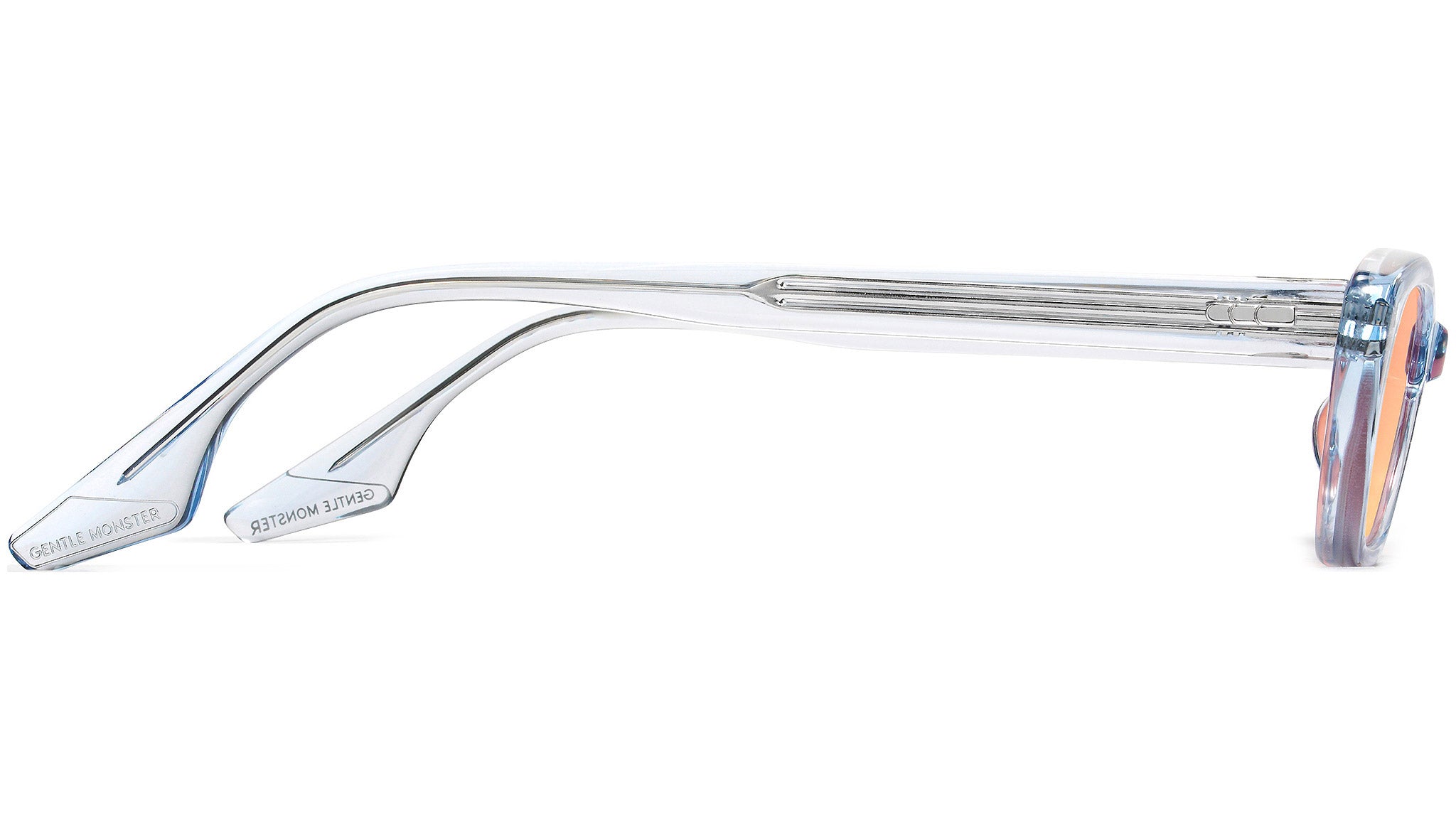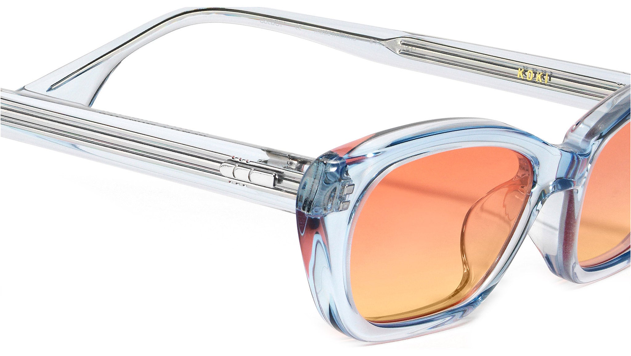 Koki BC1 is a blue cat-eye acetate frame with a sleek frame front. Featuring the triangular temple tips presented in the 2021 Collection, this playful frame is fitted with 100% UV protected orange gradient lenses.