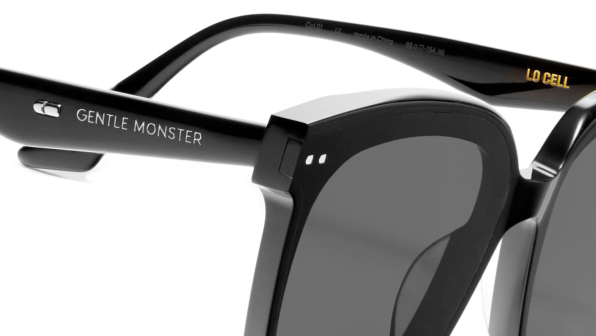 Lo Cell 01 is an oversized square Flatba frame. Distinguished by the rolled edges of the front and studs embellished on each corner of the lenses, these sunglasses feature the Gentle Monster logo accentuated by a metal detail and fitted with black Zeiss lenses with 99.9% UV protection. Oversized square Flatba frame. Bullet shaped pin details. Frame Front: 148mm, Frame Side: 153.7mm. Lens Width: 65.8mm, Lens Height: 55.6mm. Bridge: 17mm. Country of Manufacturer: China.