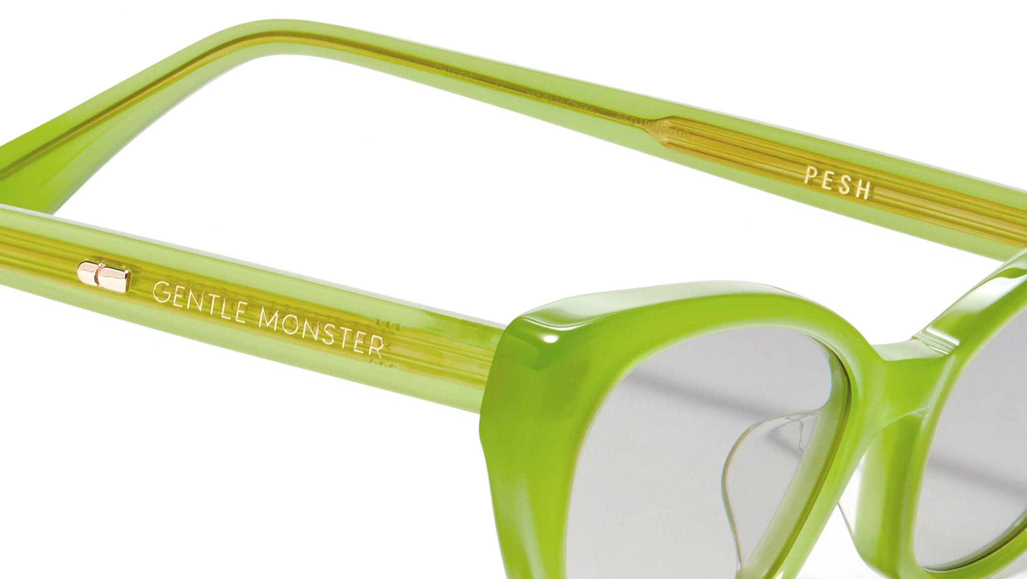 Pesh GR3 is a cat-eye silhouetted green acetate frame. The compact design features contrasting lines that accentuate each corners of the front, temples with logo details, and grey lenses with 99.9% UV protection. Acetate cat-eye frame. Exaggerated edges. Laser engraved GENTLE MONSTER logo. Frame Front: 147.4mm, Frame Side: 154.7mm. Lens Width: 33.4mm, Lens Height: 54.3mm. Country of Manufacturer: China.