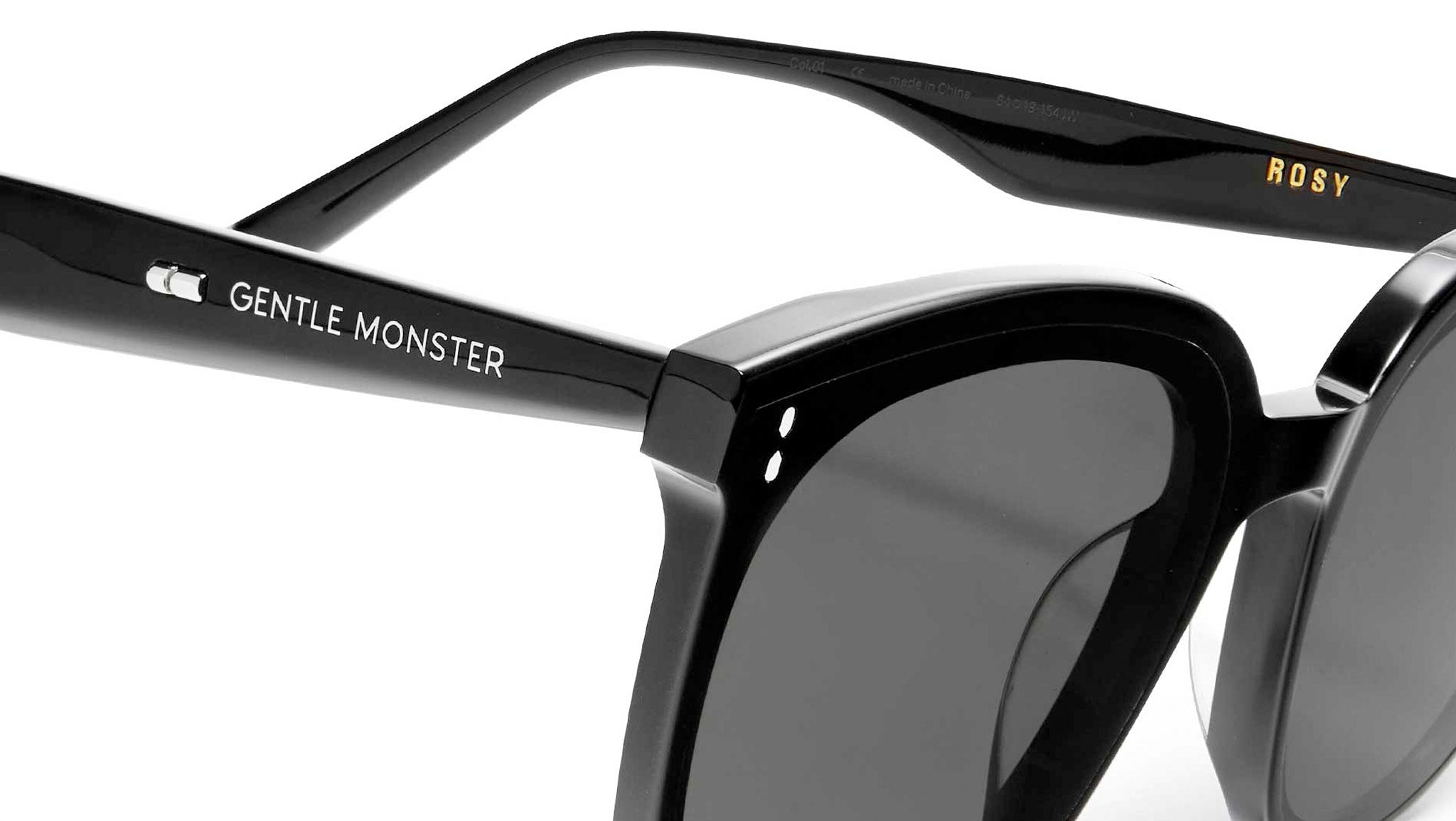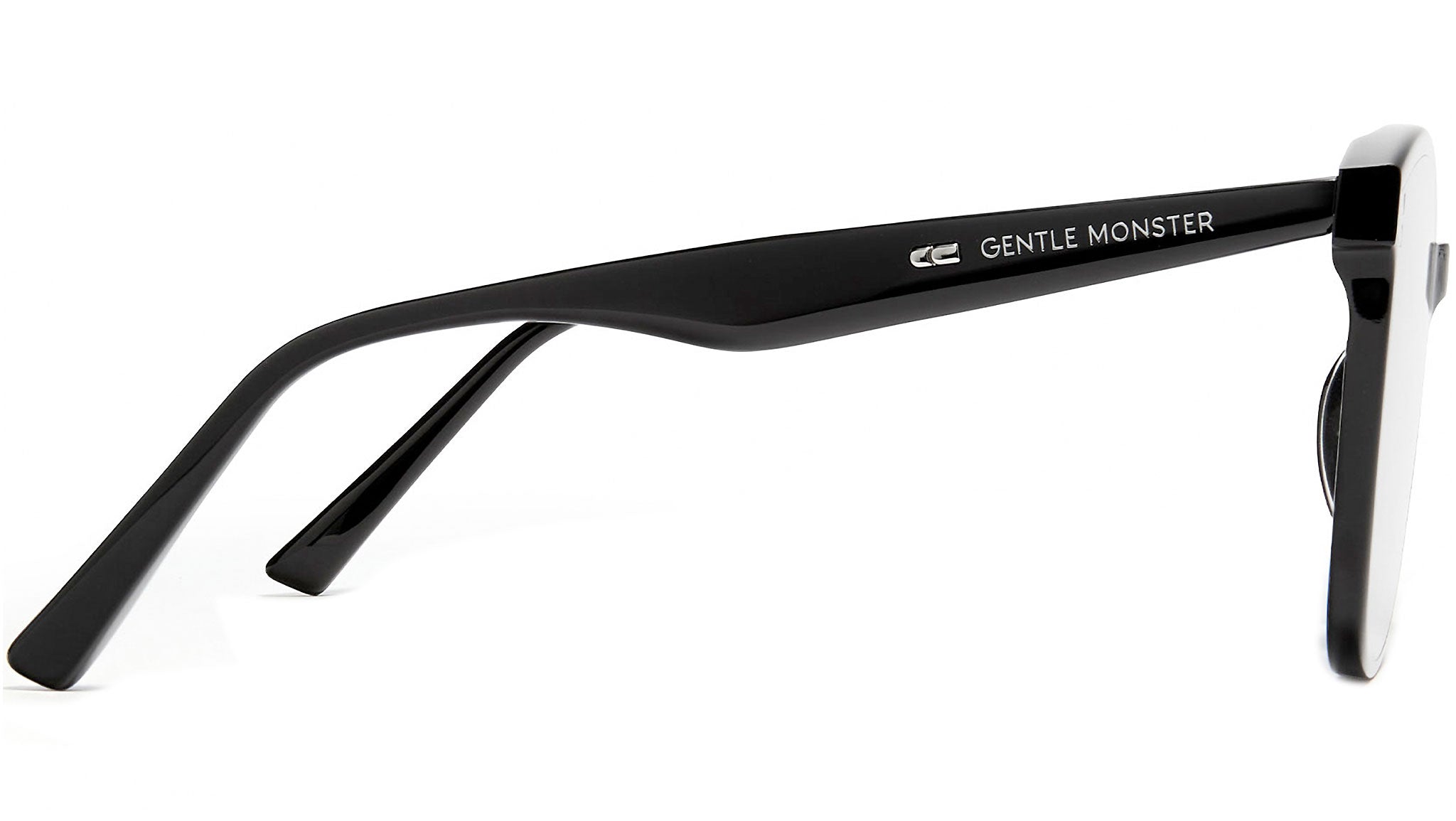 Rosy 01 is a square silhouetted black Flatba frame fitted with 99.9% UV protected black Zeiss lenses. The soft curves of the front and temples are adorned with metal accents. Square acetate frame. Square acetate frame. Laser engraved GENTLE MONSTER logo. Frame Front: 149.5mm, Frame Side: 153.9mm. Lens Width: 55mm, Lens Height: 63.7mm. Country of Manufacturer: China.