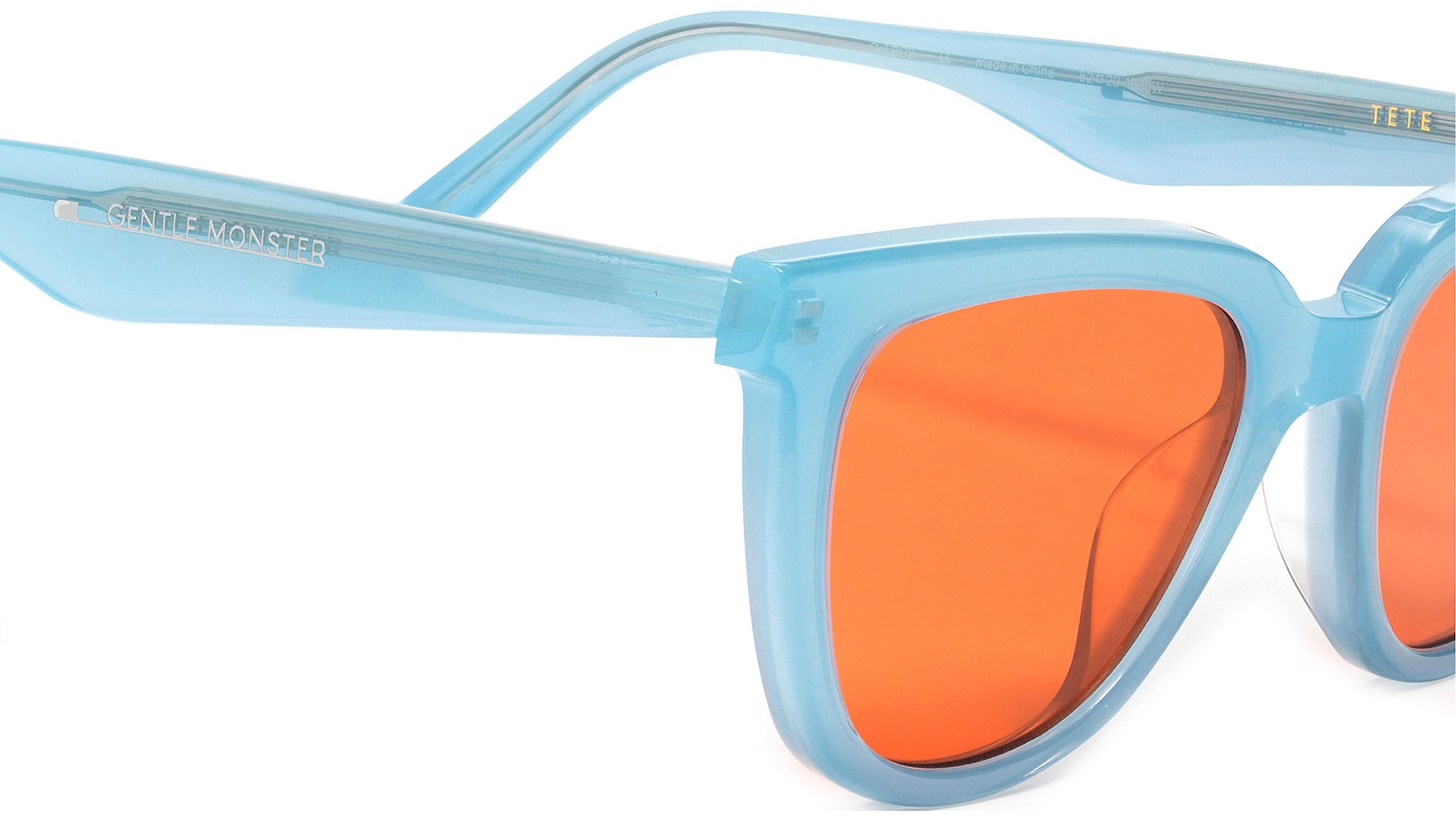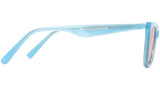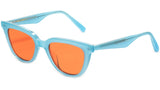 Tete BC2 is a blue acetate cat-eye frame with voluminous temples. This frame features contrasting lines and curves, clear cut endpieces and fitted with 100% UV protected orange lenses.