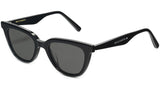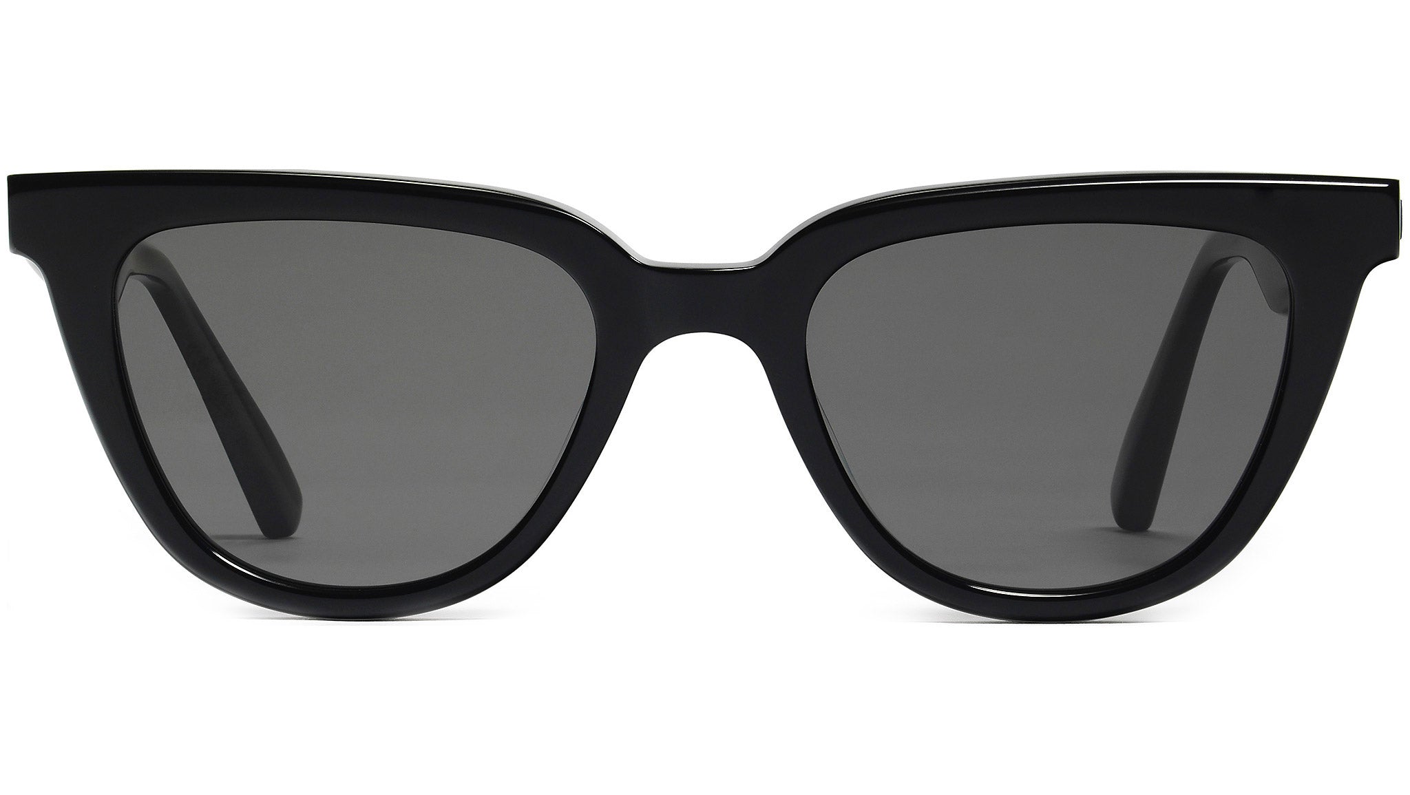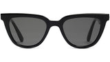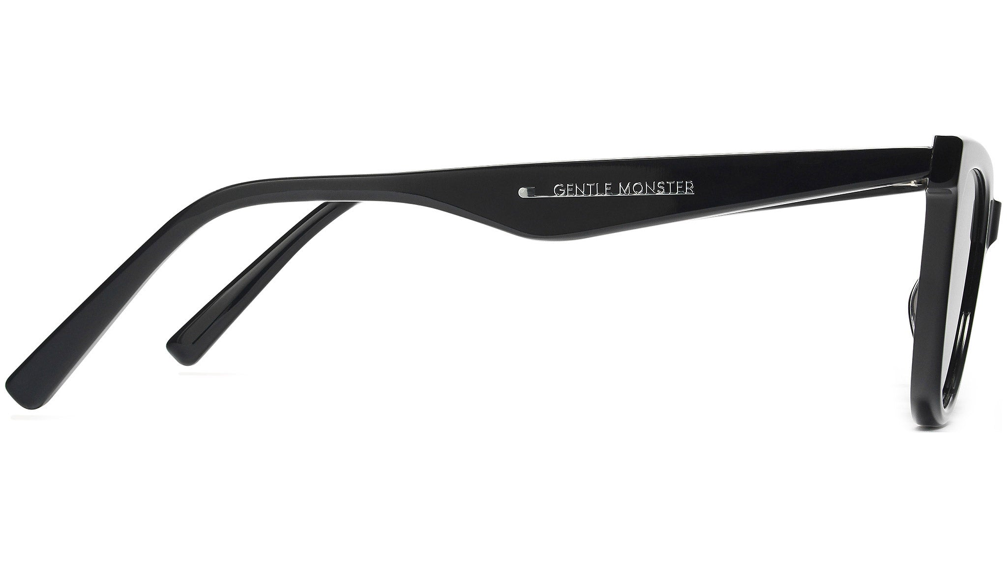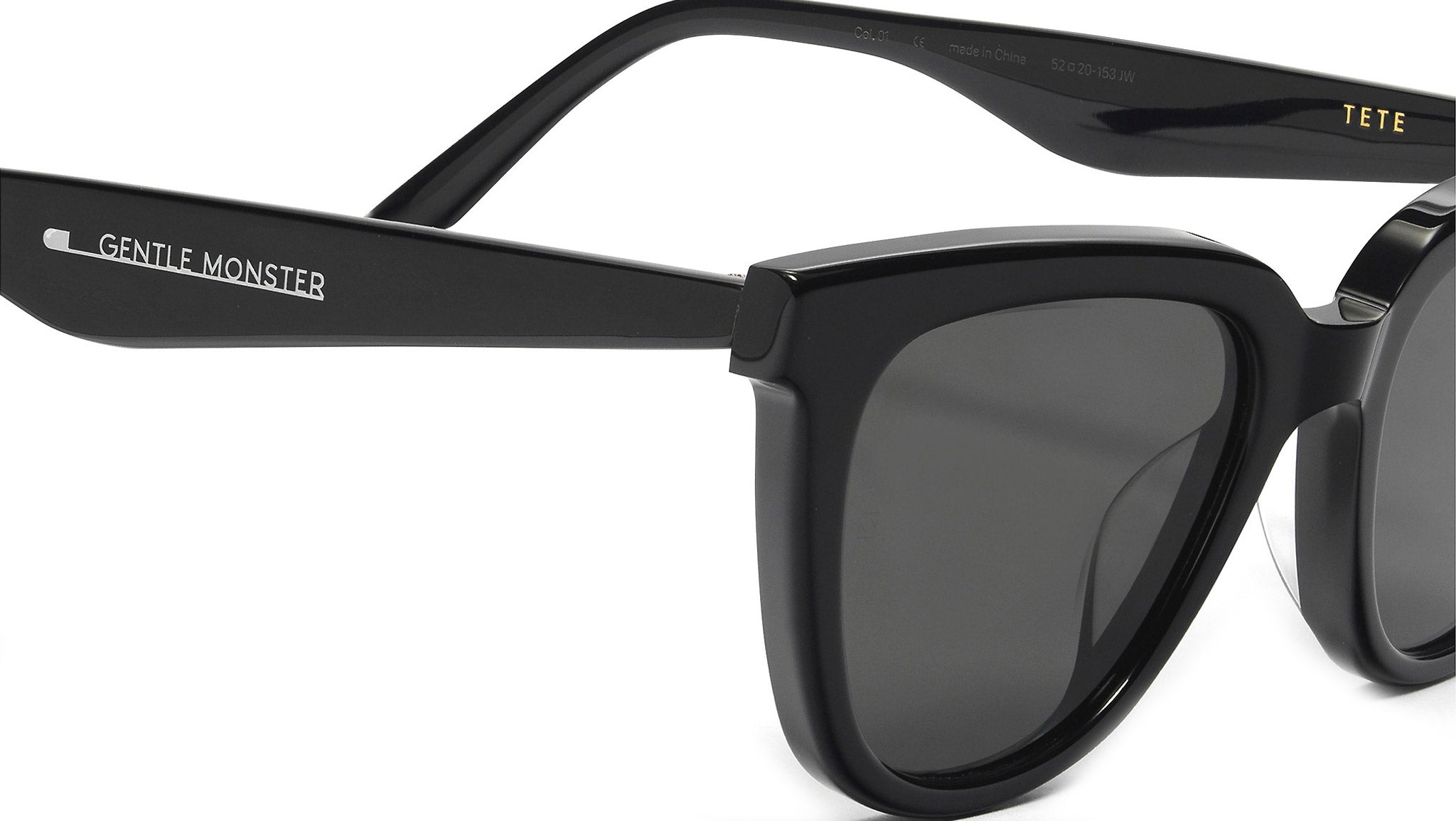 Tete 01 is a black acetate cat-eye frame with voluminous temples. This frame features contrasting lines and curves, clear cut endpieces and fitted with 100% UV protected black Zeiss lenses.