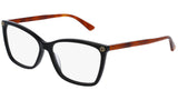 Gucci optical collection model GG0025O 003 featuring shiny black frame and havana temple. Gucci Eyewear offer eclectic and contemporary creations that represent the pinnacle of Italian craftsmanship and are unsurpassed in quality, attention to detail and imaginative design. Buy your frames online and take them to your local optician to fit prescription lenses.