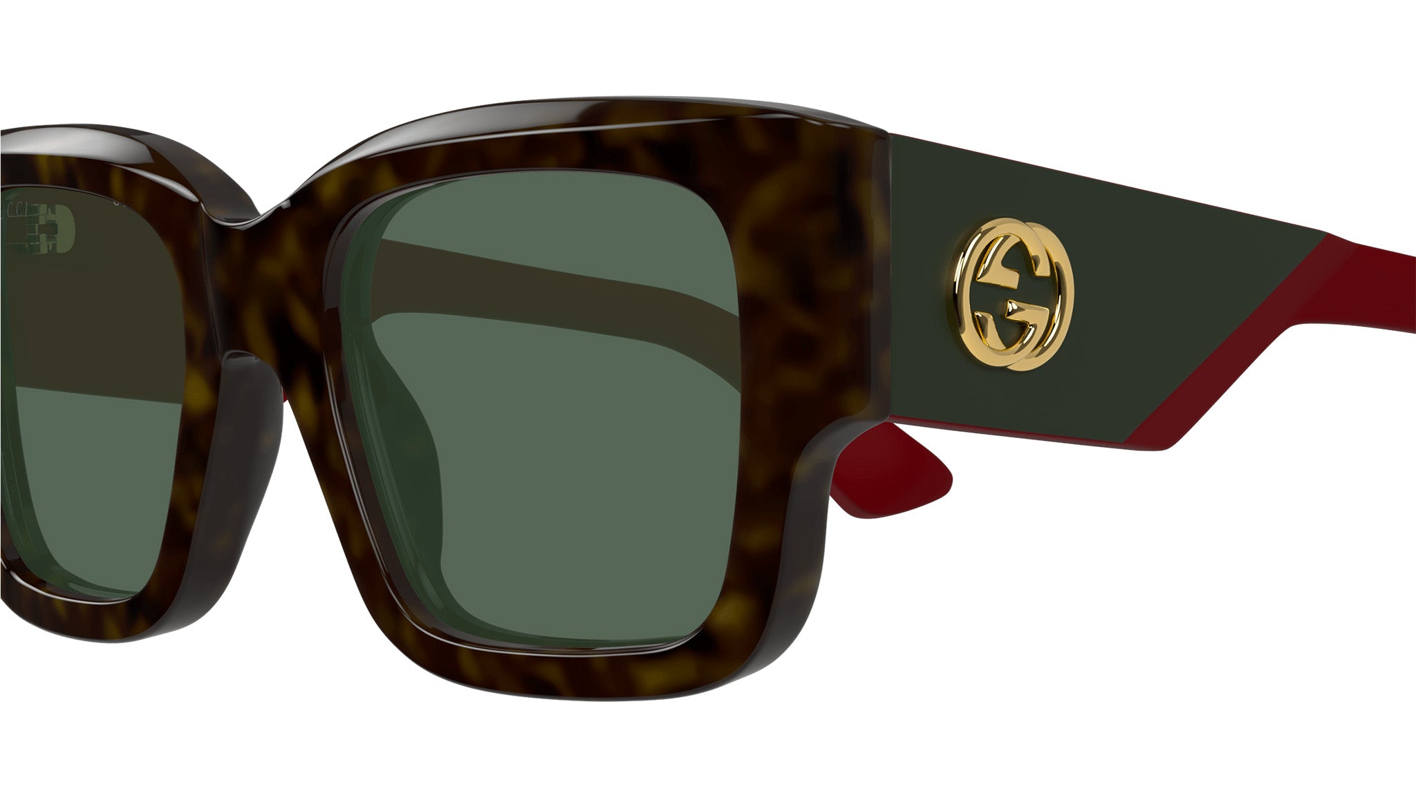 Occhiali da sole Gucci modello GG1663S linea GG Logo in acetato riciclato forma rettangolare codice colore 002 tartaruga scuro lucido con aste rosso e lenti verde scuro tinta unita. Rivenditore autorizzato Gucci online. Gli occhiali vengono consegnati con custodia e accessori originali e sono coperti dalla garanzia ufficiale di 12 mesi del produttore.