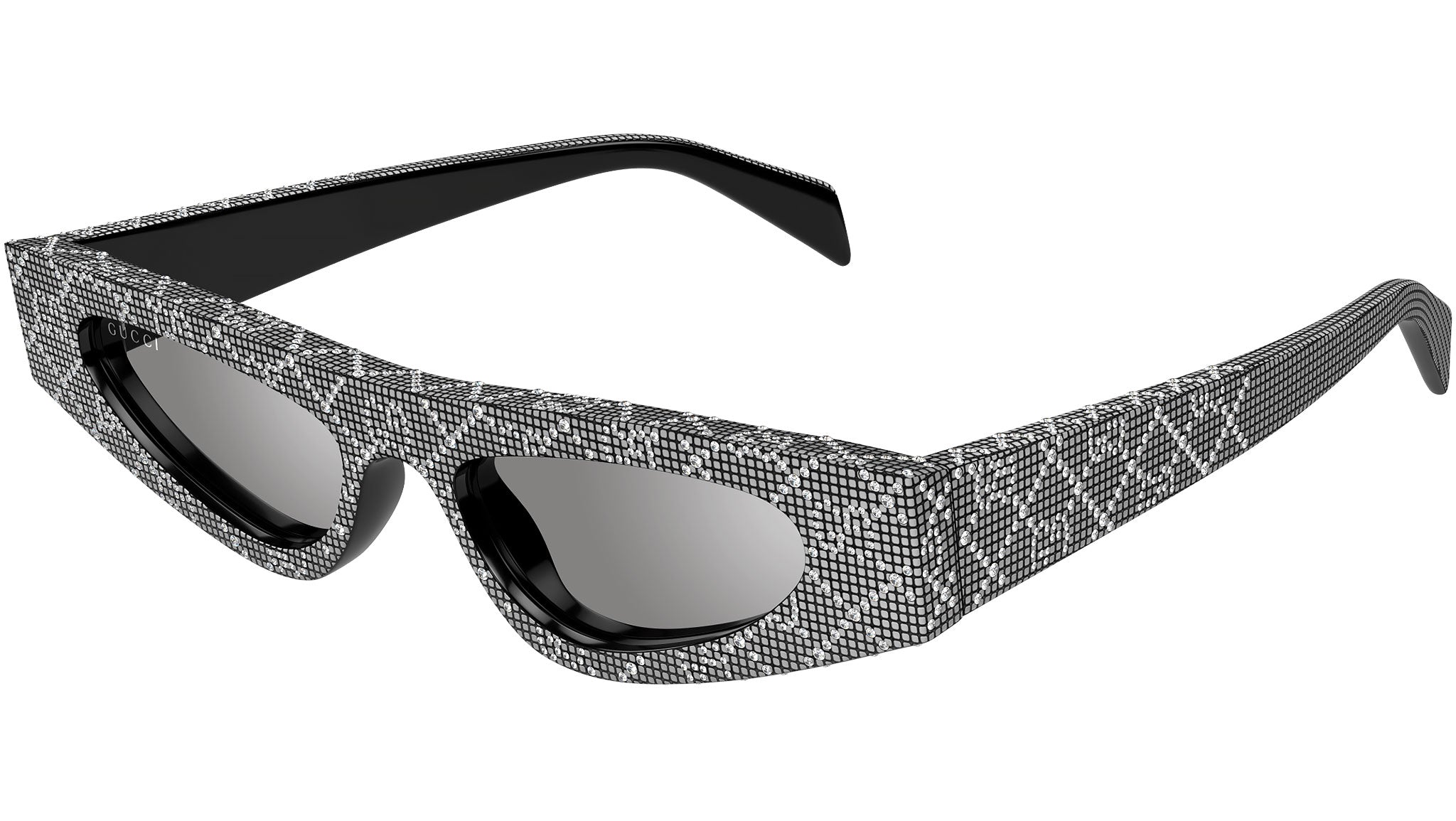 Occhiali da sole Gucci modello GG1779S linea Fashion in acetato riciclato forma a gatto codice colore 009 nero lucido con strass di cristallo all over e argento lucido con aste nero e lenti grigio pieno + argento super forte. Rivenditore autorizzato Gucci online. Gli occhiali vengono consegnati con custodia e accessori originali e sono coperti dalla garanzia ufficiale di 12 mesi del produttore.