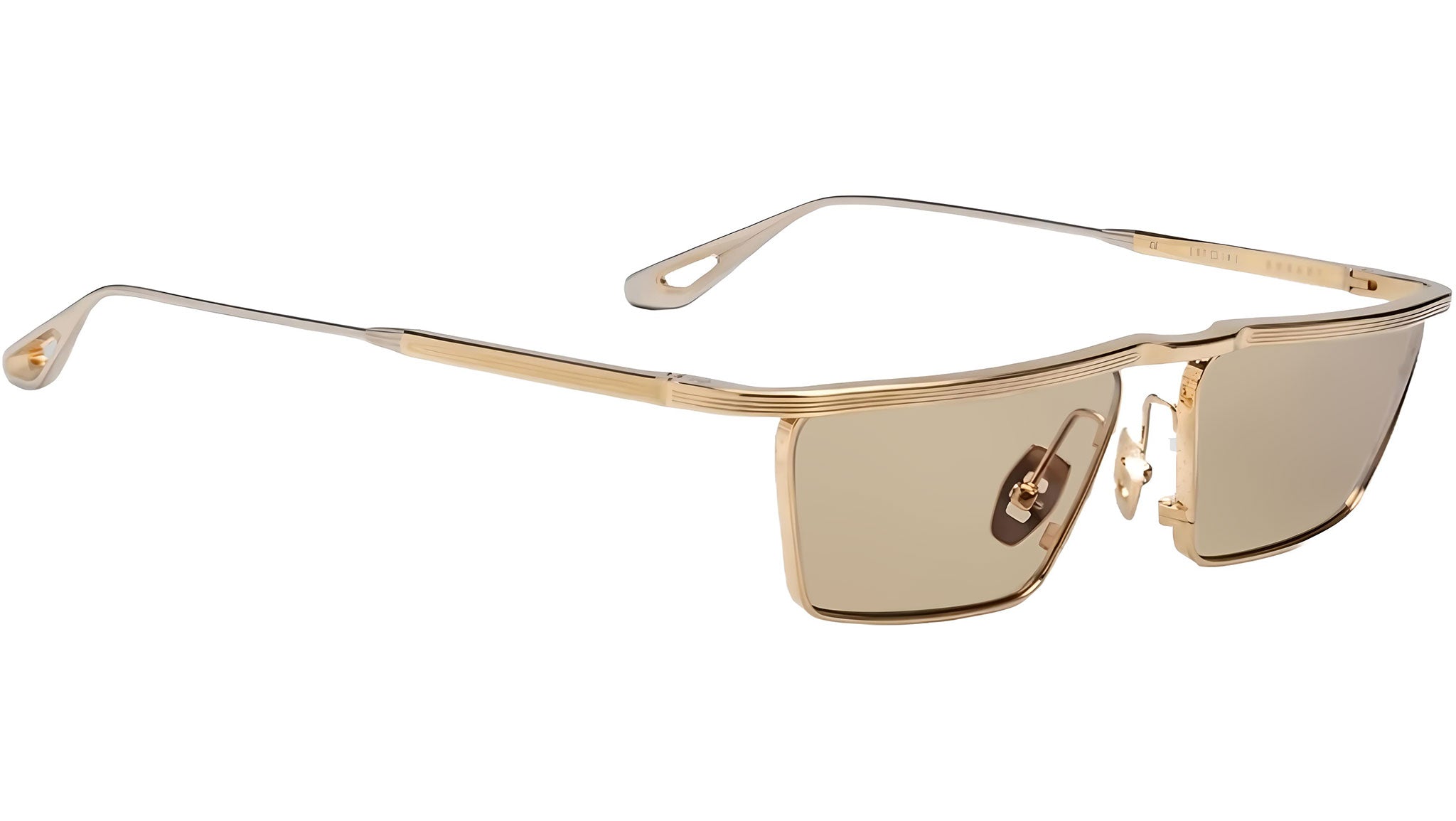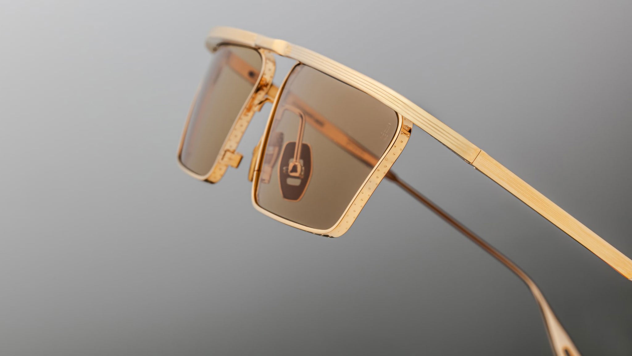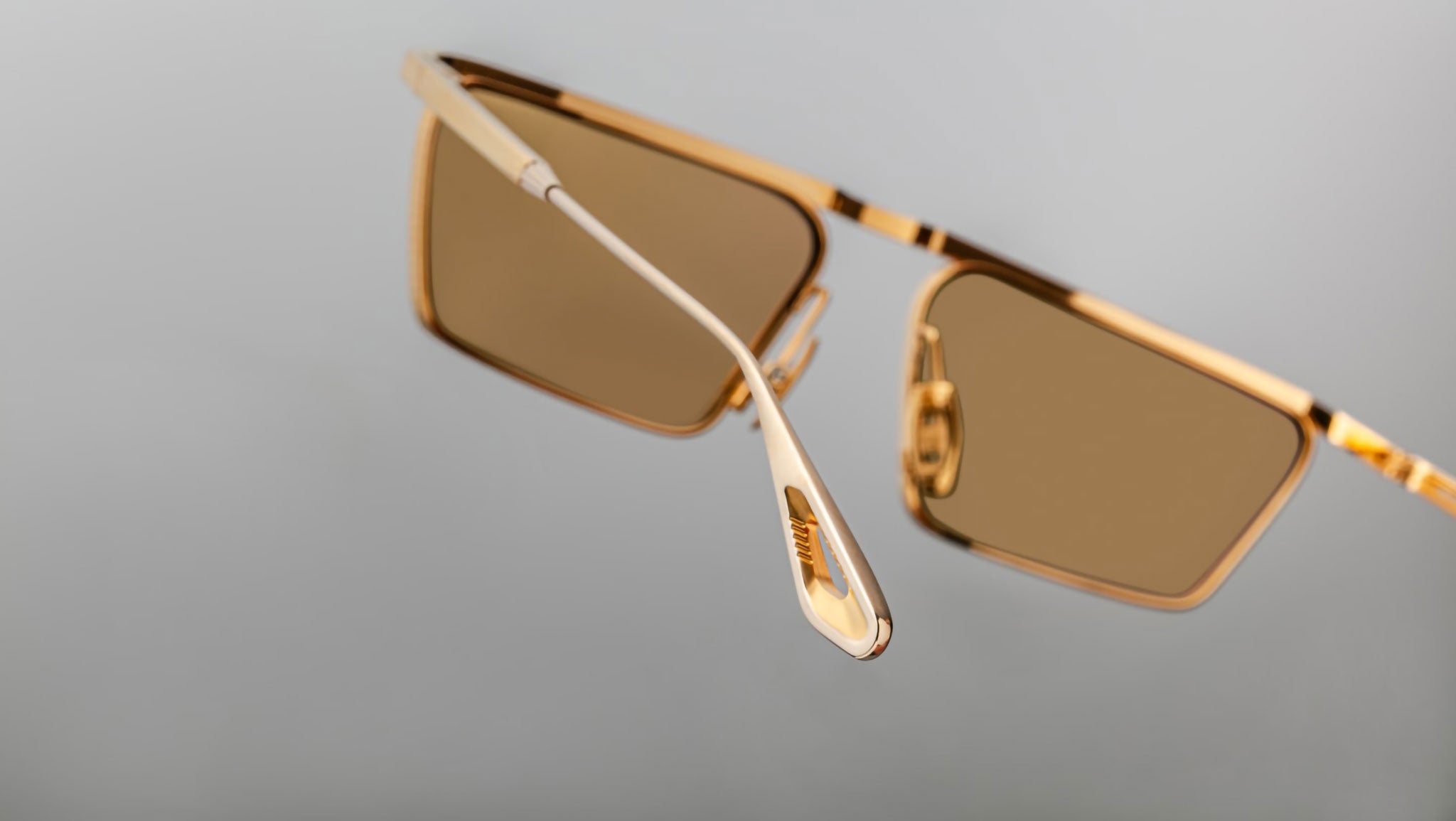 Dark gold 100% beta titanium frame with light gold accents and brown lenses. Features dark gold and light gold titanium temples with eyelet wing tips, a dark gold tension-secured custom monoblock hinge, and custom nose pads with logo and hairline engraving. Sepia CR-39 6 base lenses with backside anti-reflective treatment ensure clarity and comfort. Provides 100% UV protection. Frame total width: mm.