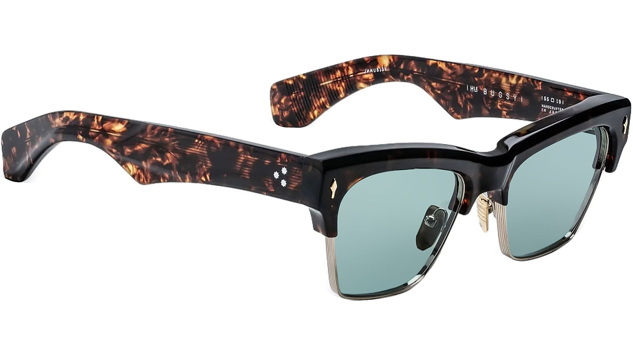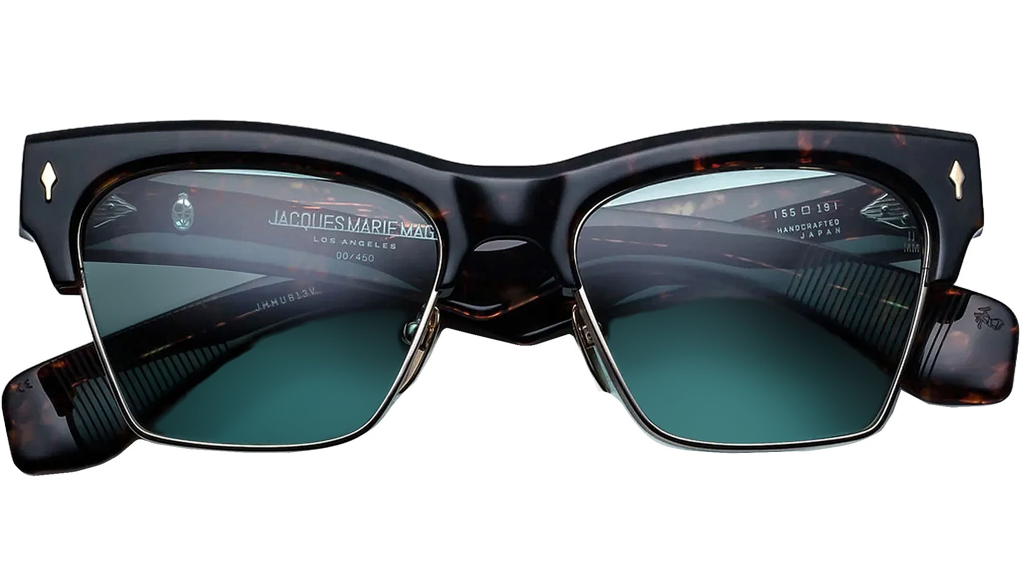 The Jacques Marie Mage Bugsy sunglasses are mid-century inspired classics with a medium fit, meticulously handcrafted with a sleek titanium lens rim paired with sculptural acetate detailing across the monobrow and temples. Signature arrowhead front pins and polished metal accents enhance their refined aesthetic. This limited-edition design reflects the brand’s commitment to craftsmanship and innovation, offering a bold yet sophisticated look rooted in vintage elegance and modern luxury.