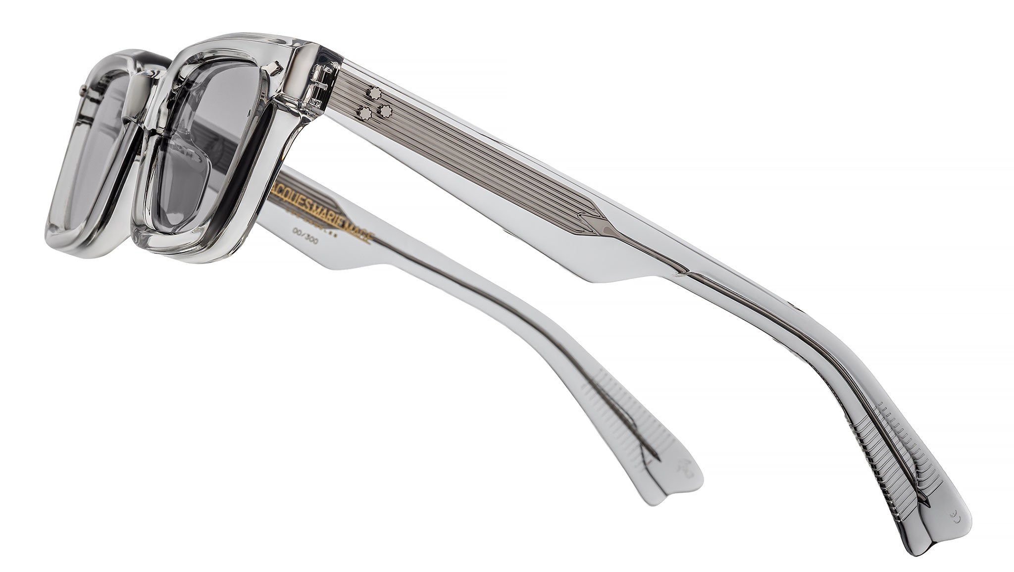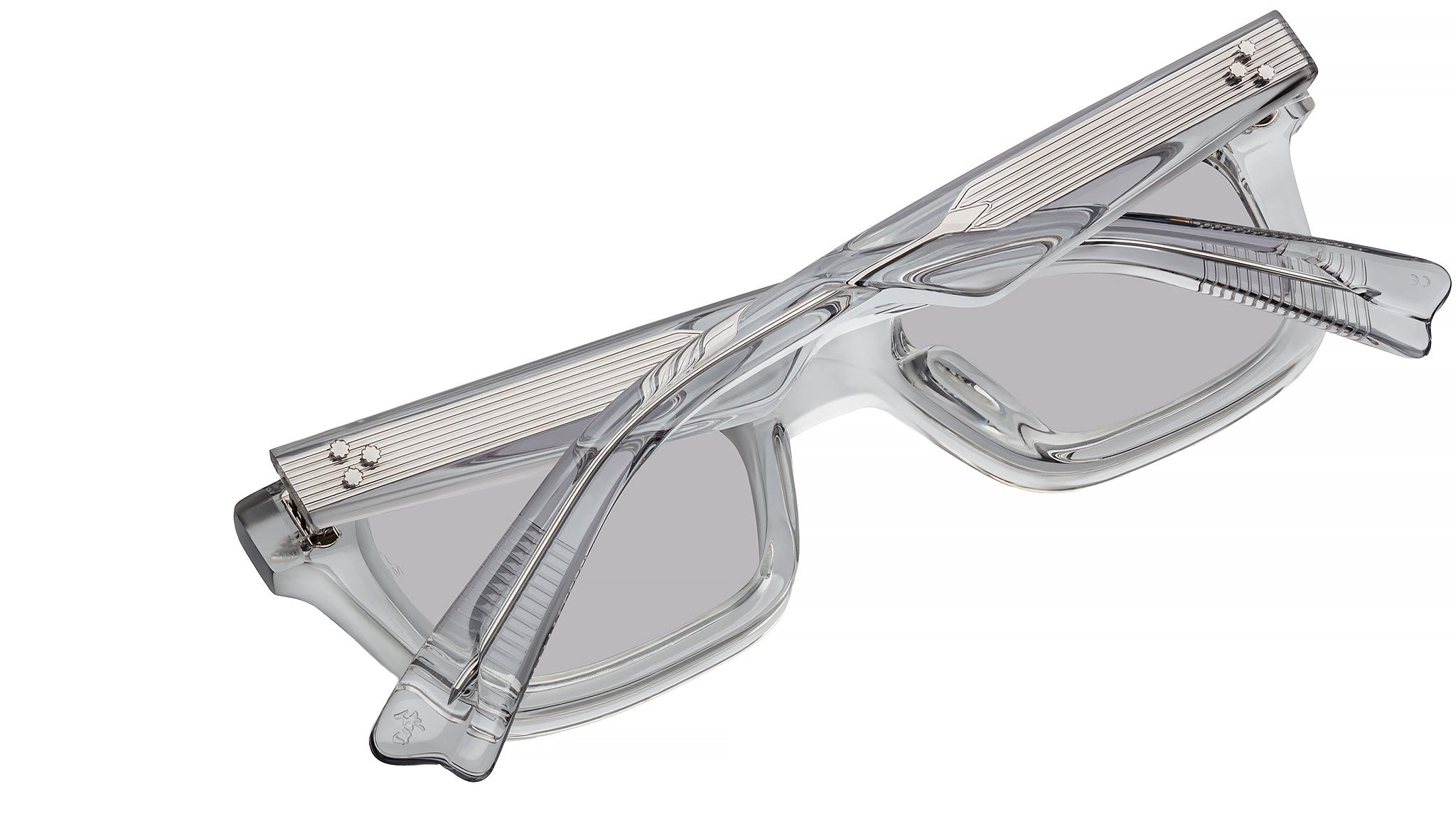 Crafted from 10mm grey cured cellulose acetate, this frame features custom acetate temples adorned with precious metal hardware and fitted with matching grey lenses. Sterling silver signature arrowhead front pins and exposed silver-finished 'Classic' wirecores emphasize the meticulous craftsmanship, while custom stainless steel 7-barrel hinges with Art Deco hairline detailing offer both strength and sophistication. The Dove Armorlite 4-base lenses include a backside anti-reflective treatment, ensuring enhanced visual clarity and comfort.