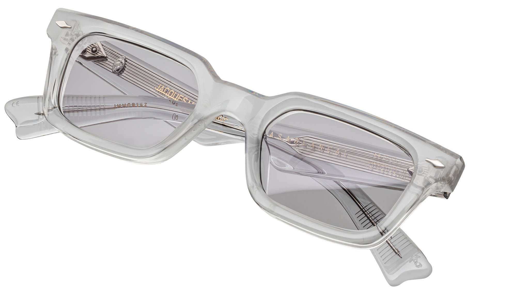 The Jacques Marie Mage Casablanca Sulfur sunglasses are compact and slender, showcasing a refined rectangular lens shape paired with a clever brow line and a delicate, minimalist bridge. The design is elevated by double-laminated temples and the brand's signature polished metal hardware, combining sharp proportions with sophisticated detailing for a look that is both subtle and striking.