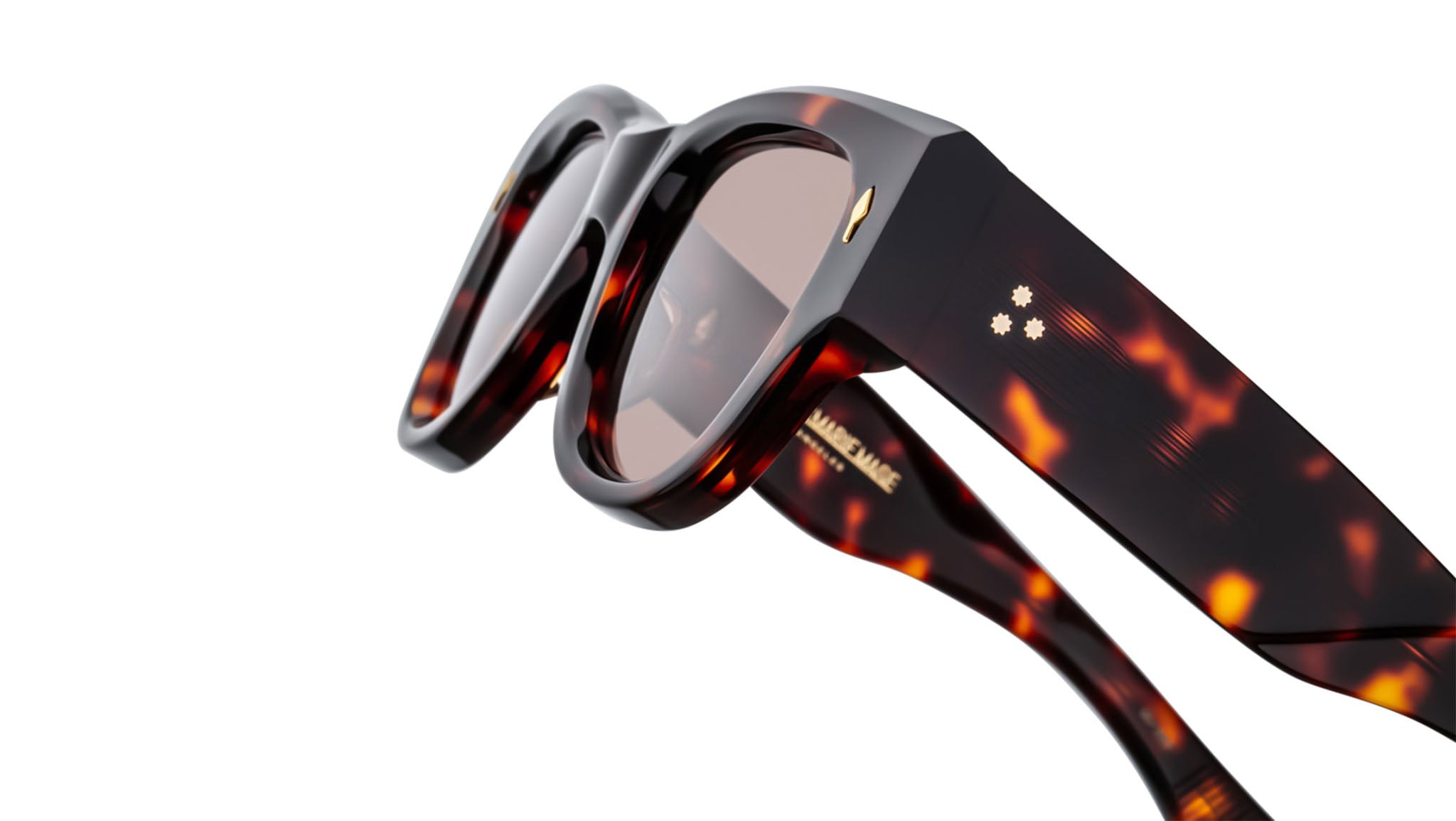 Havana 10mm cured cellulose acetate frame with custom double-laminated acetate temples and dark gold precious metal hardware. Features include a signature arrowhead front pin, dark gold cantilever wirecore, and tension-secured custom 7-barrel hairline hinge. Equipped with bronze CR-39 4 base lenses featuring backside anti-reflective treatment. Frame shape: medium. Offers 100% UV protection.