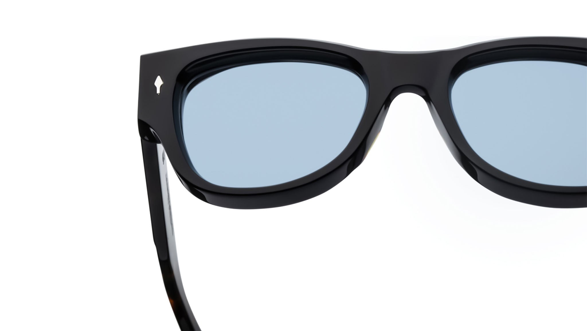 Black 10mm cured cellulose acetate frame with custom double-laminated acetate temples and sterling silver hardware. Features include a signature arrowhead front pin, silver cantilever wirecore, and tension-secured custom 7-barrel hairline hinge. Fitted with cerulean CR-39 4 base lenses with backside anti-reflective treatment for optimal clarity. Frame shape: medium. Provides 100% UV protection.