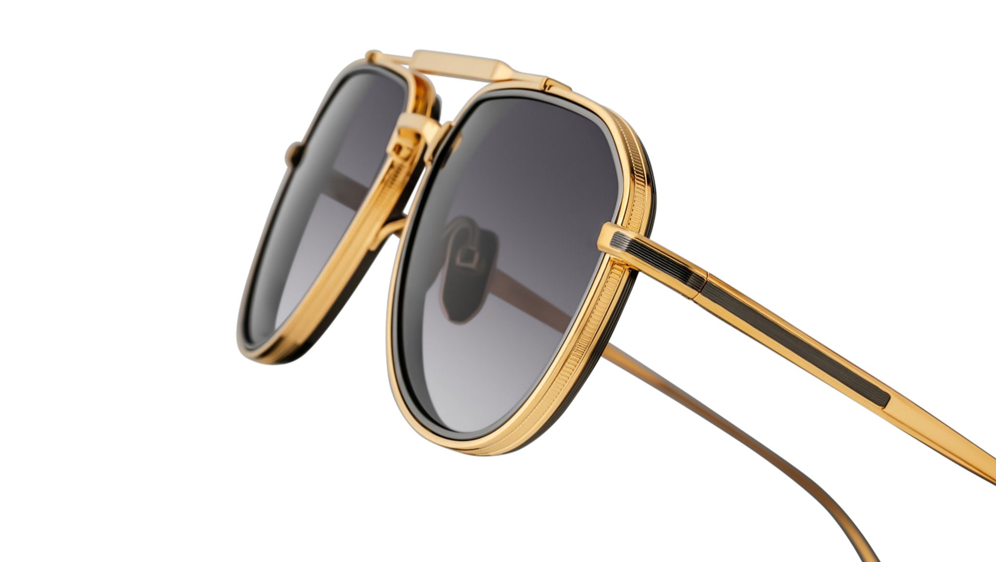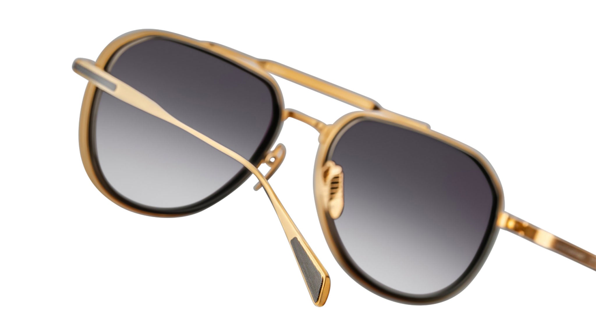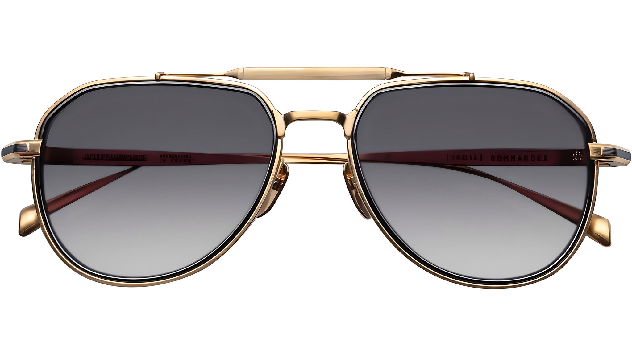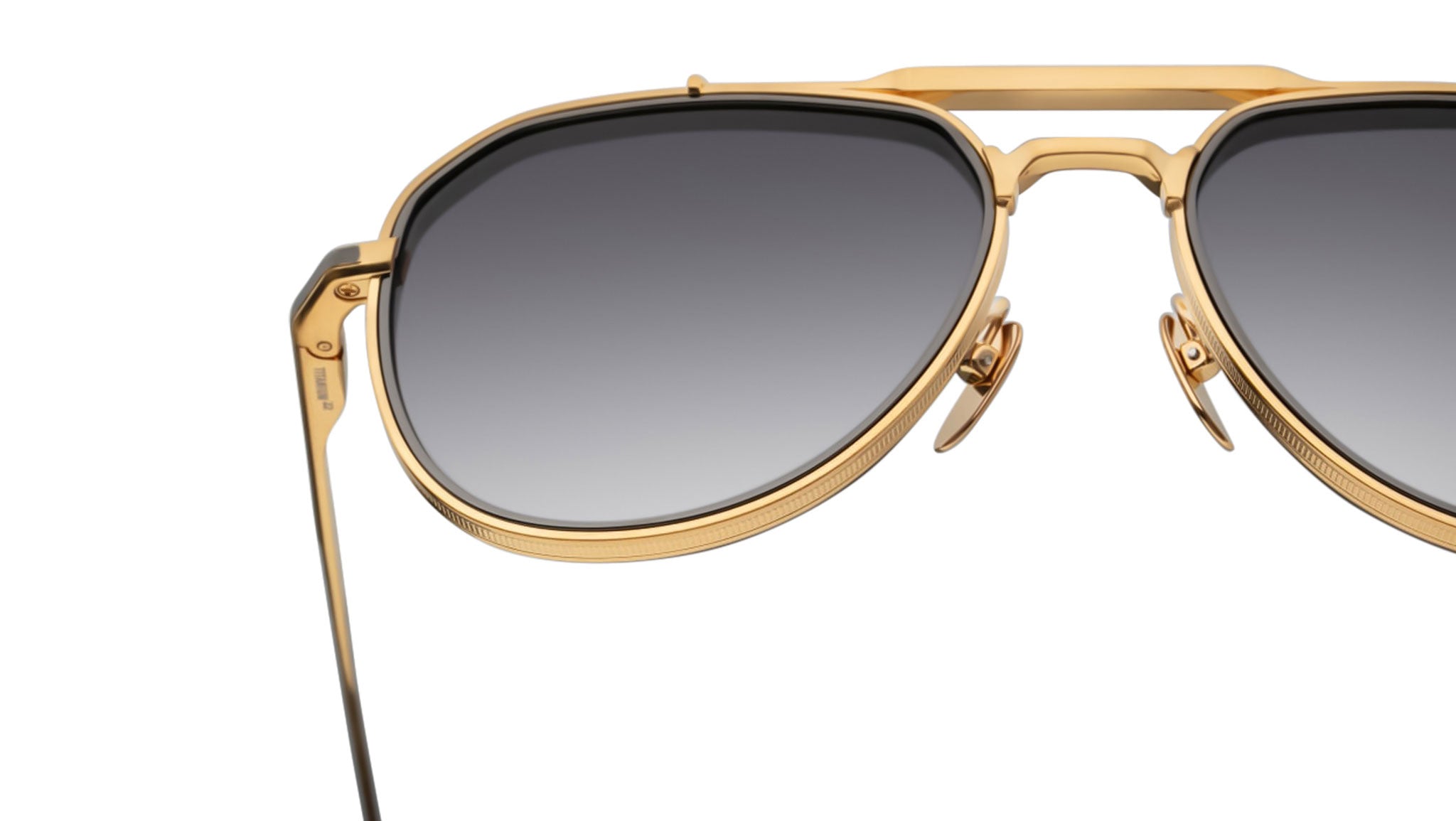 Gli occhiali Jacques Marie Mage Commander, ispirati ai pilot anni '70, combinano eleganza senza tempo e audacia moderna. Montatura in titanio oro scuro con inserti in titanio nero e dettagli incisi, aste scolpite e cerniere nascoste personalizzate. Lenti CR-39 Jet sfumate nere con trattamento antiriflesso interno e protezione UV 100%. Presentati in un cofanetto in seta con custodia in pelle artigianale e certificato numerato, riflettono artigianalità ed esclusività. Edizione limitata di 400 pezzi. Codice modello: JMMMD-C7.