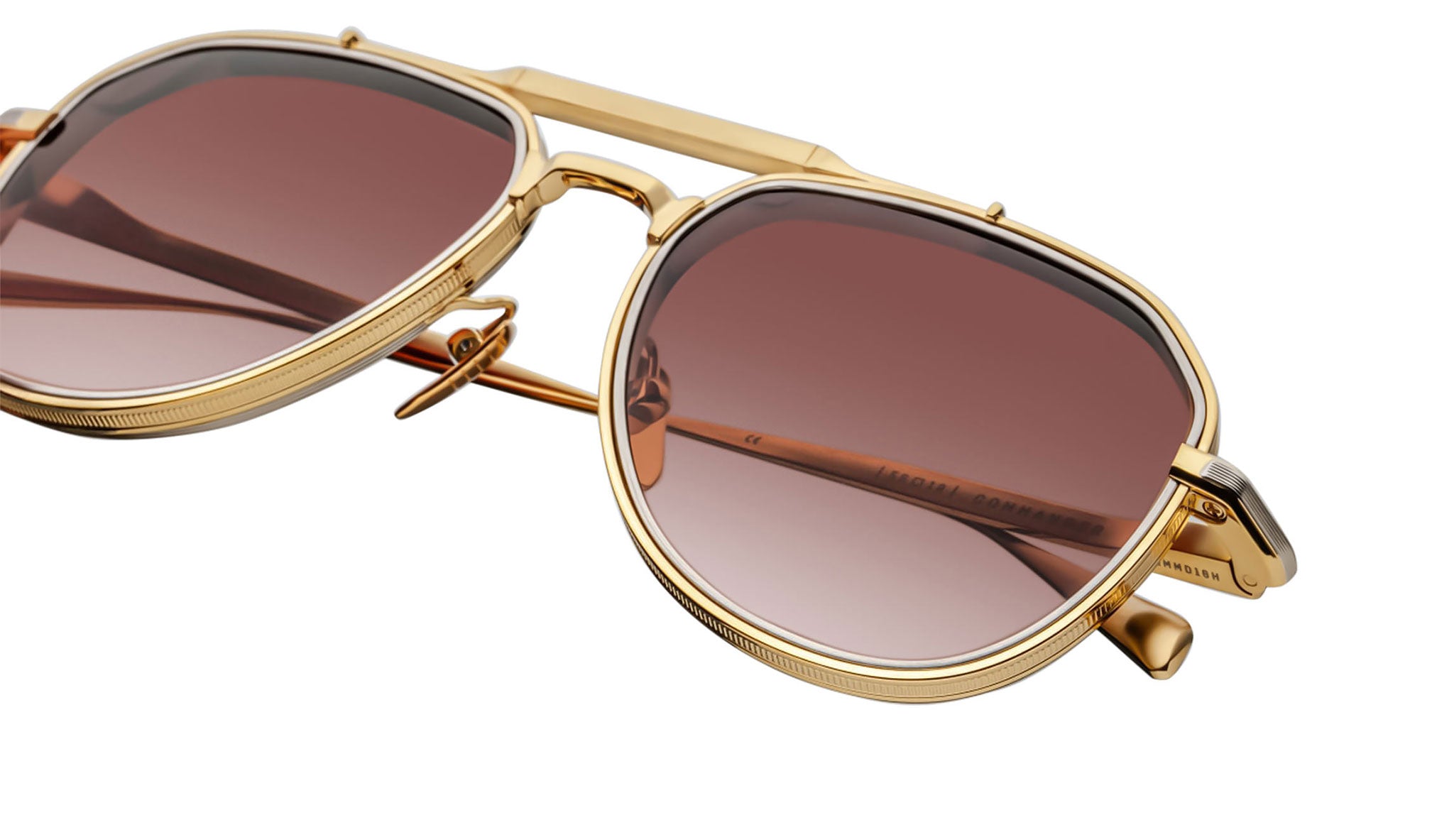 Gli occhiali Jacques Marie Mage Commander, ispirati ai pilot anni '70, combinano eleganza senza tempo e audacia moderna. Montatura in titanio oro scuro con inserti in titanio argento e dettagli incisi, aste scolpite e cerniere nascoste personalizzate. Lenti CR-39 rosse sfumate Tuscan con trattamento antiriflesso interno e protezione UV 100%. Presentati in un cofanetto in seta con custodia in pelle artigianale e certificato numerato, riflettono artigianalità ed esclusività. Edizione limitata di 450 pezzi. Codice modello: JMMMD-16H.