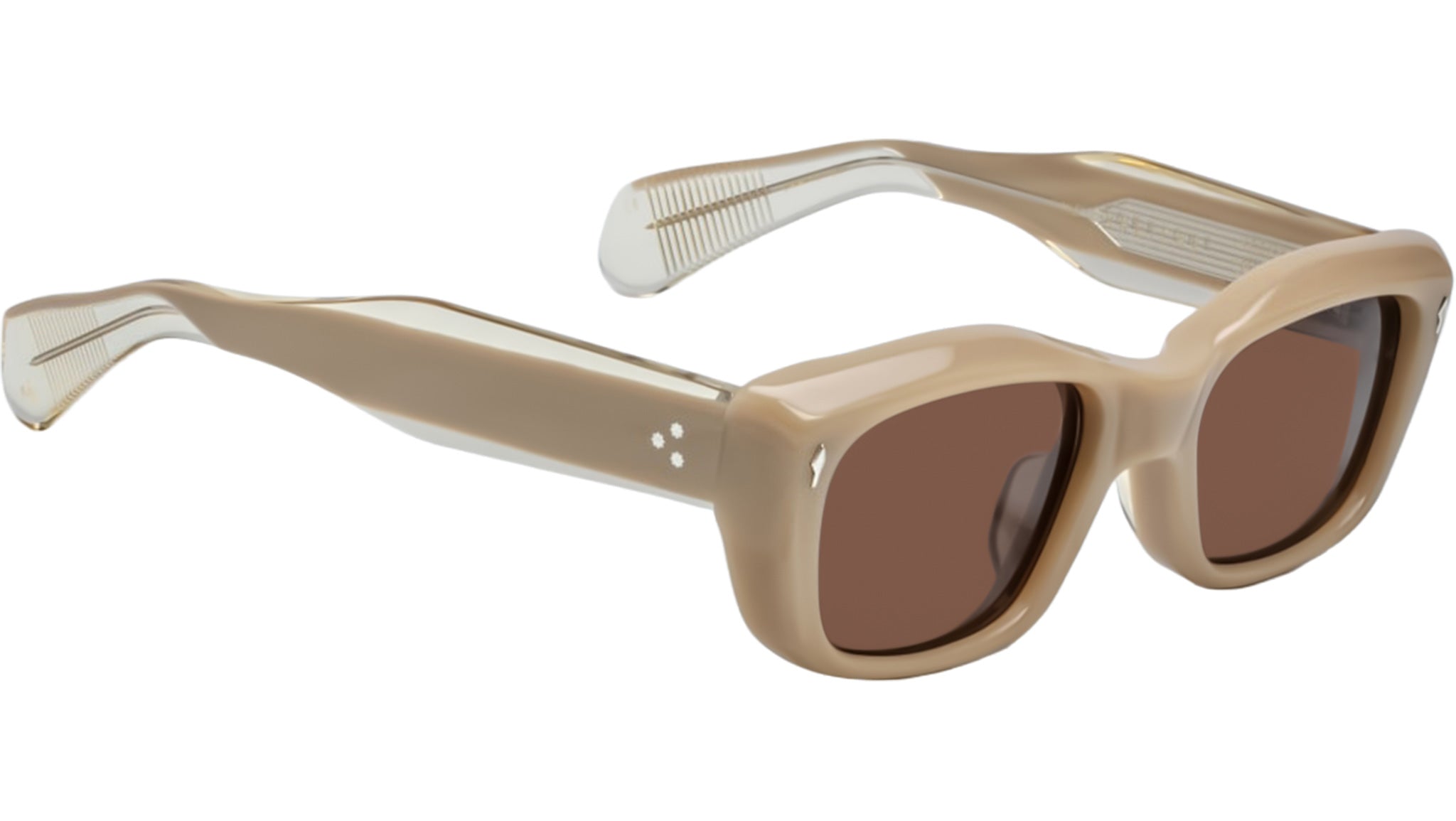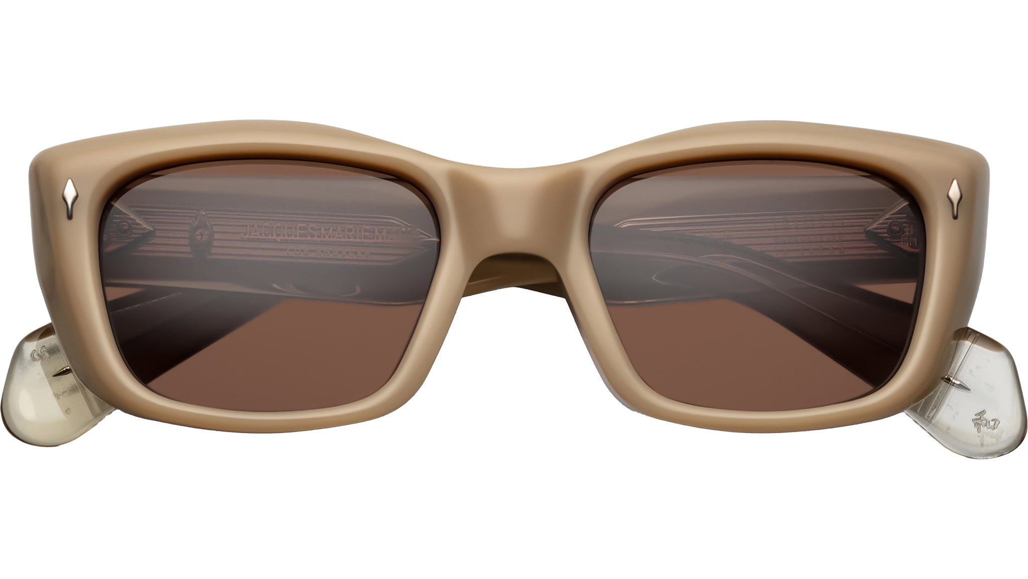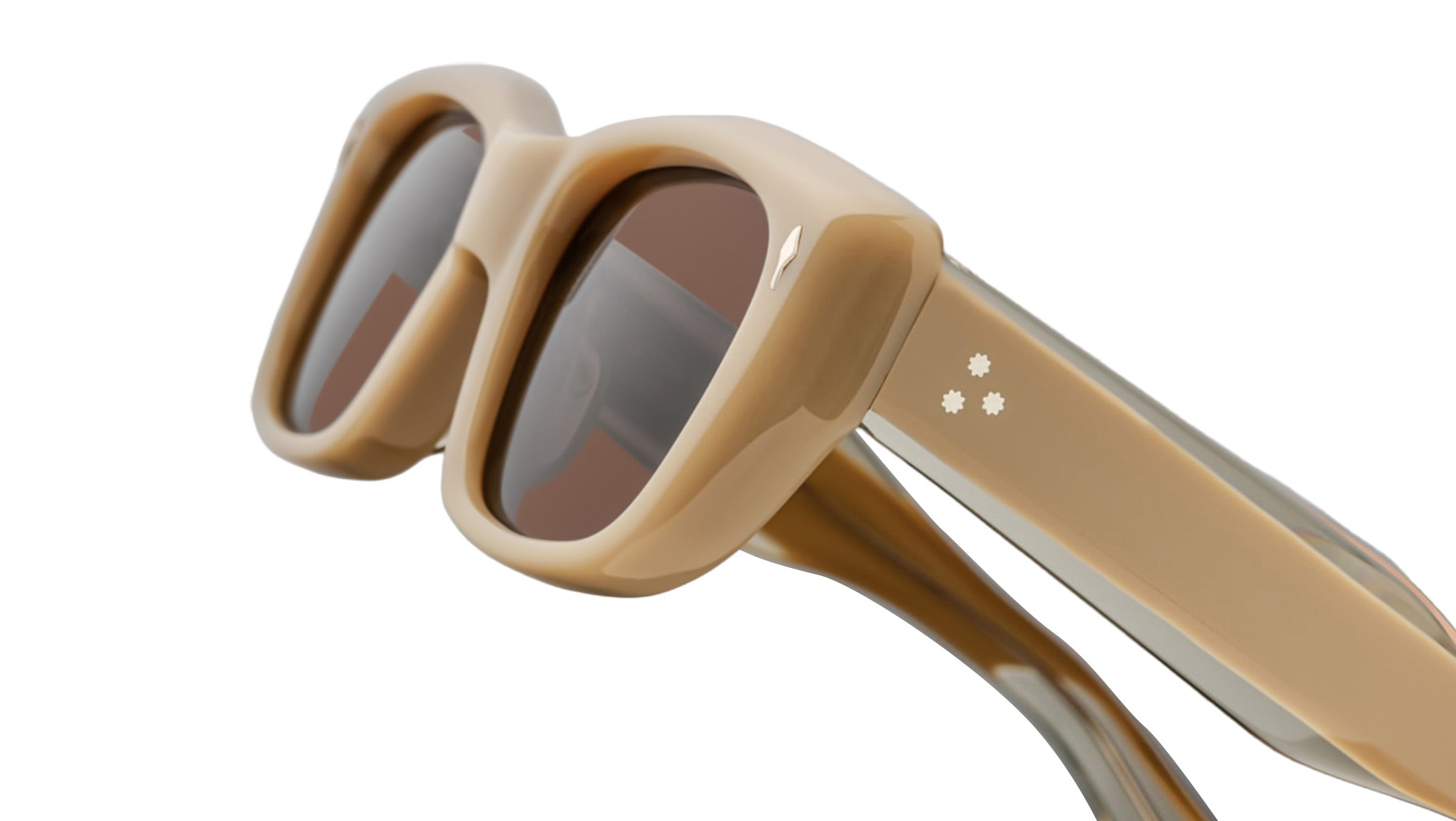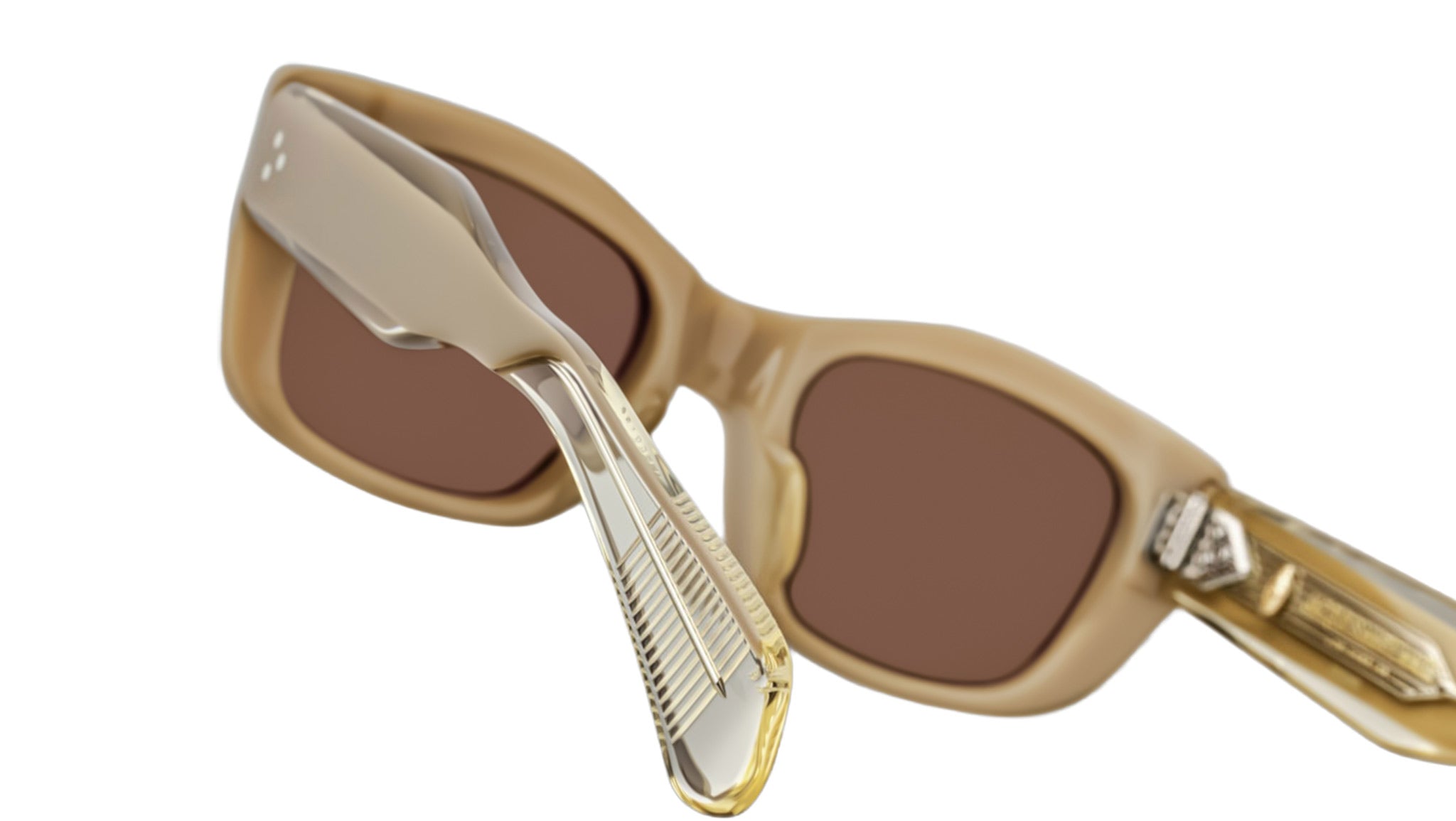 Tan 10mm cured cellulose acetate frame with custom double-laminated acetate temples featuring precious metal hardware and brown lenses, sterling silver signature arrowhead front pin, hidden silver Classic wirecores, silver tension-secured custom 9-barrel hairline hinge, Choco CR-39 4 base lenses with backside anti-reflective treatment, 100% UV protection.