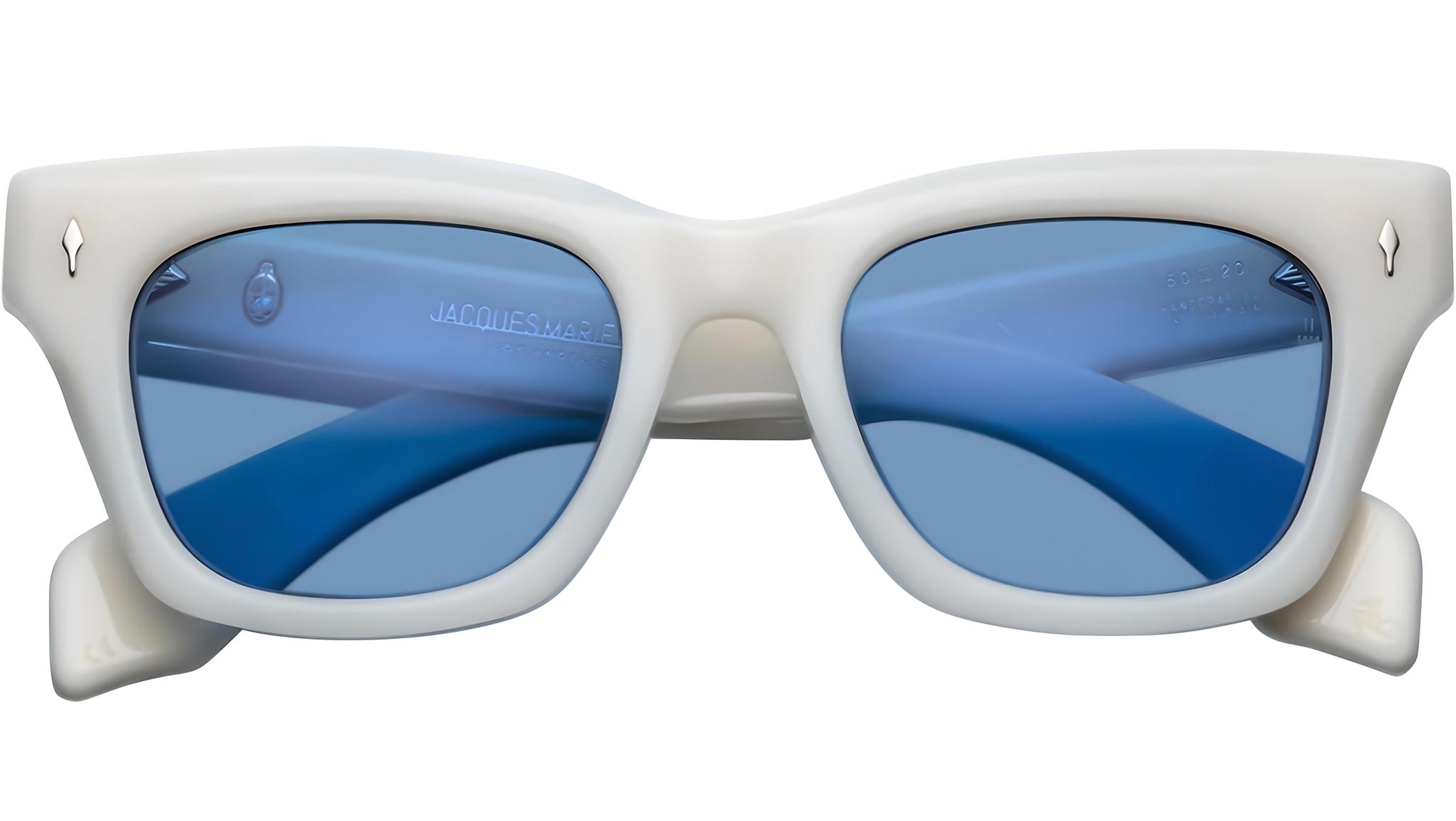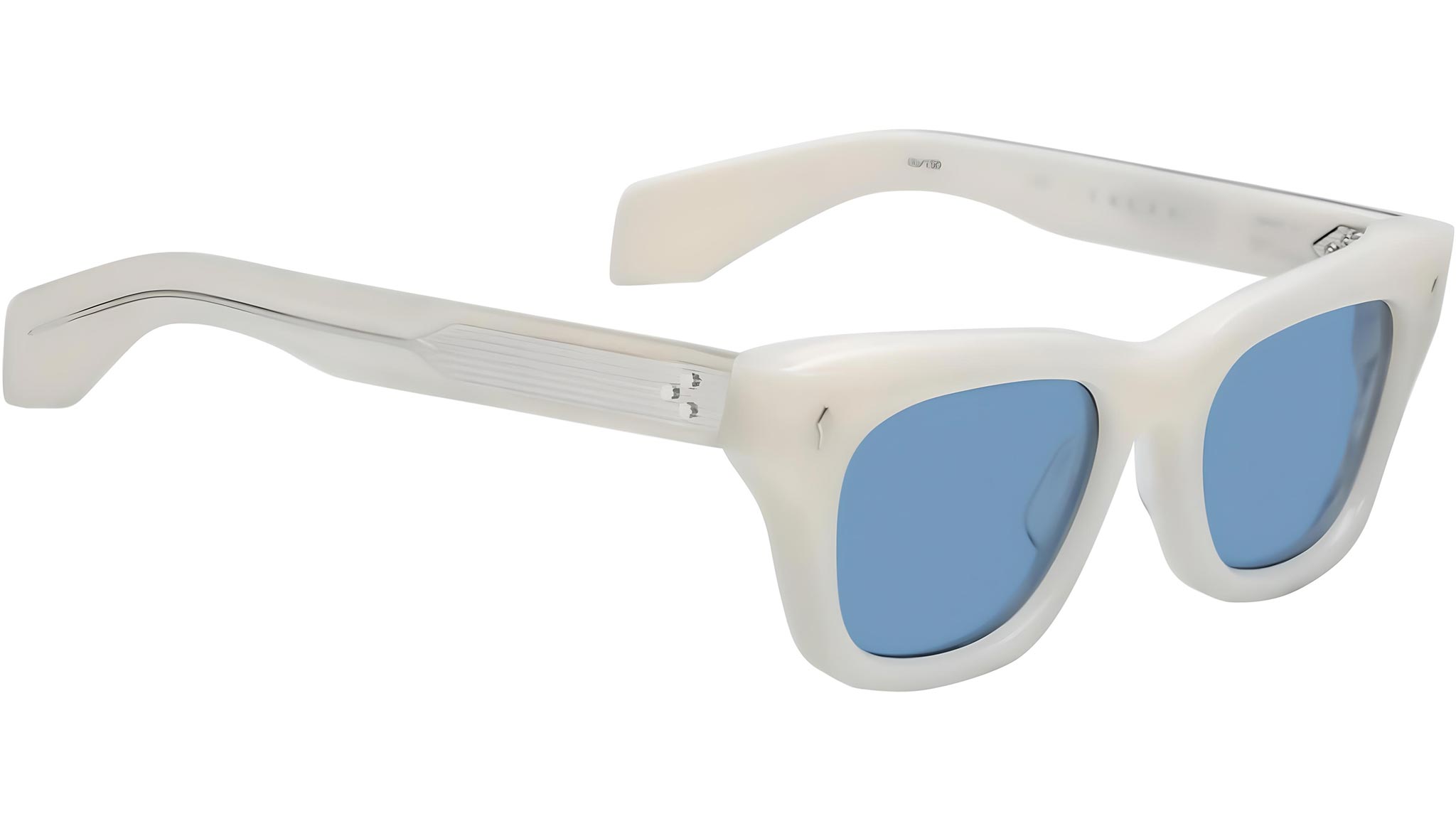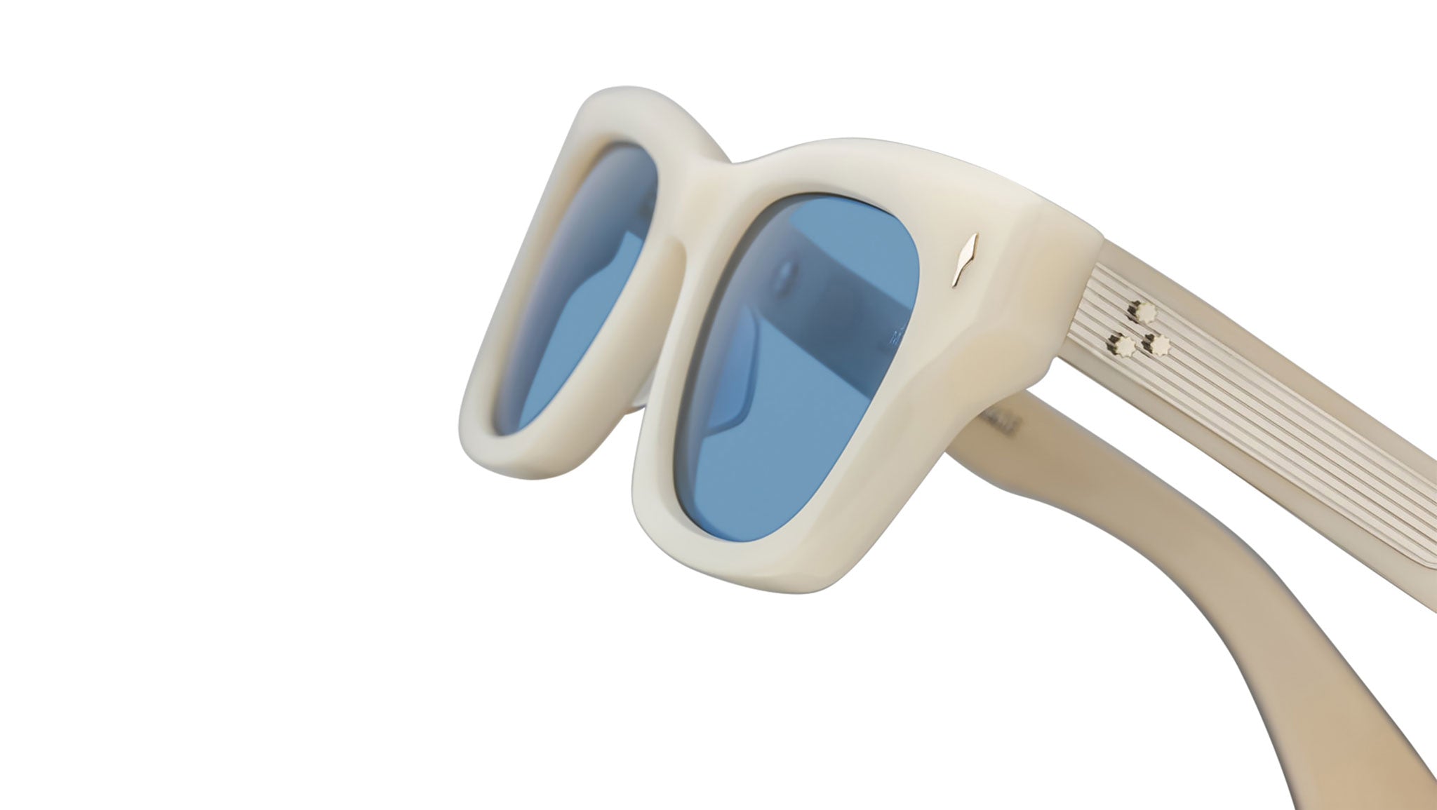 Gli occhiali Jacques Marie Mage Dealan, icona originale di JMM, uniscono volumi audaci, linee eleganti e dettagli in metallo prezioso, ispirandosi agli anni '60. Montatura squadrata in acetato bianco con rivetti a freccia in argento, anima metallica incisa e cerniera a 7 barrette. Lenti CR-39 blu con trattamento antiriflesso interno e protezione UV 100%. Presentati in un cofanetto in seta con custodia in pelle artigianale e certificato numerato. Edizione limitata di 150 pezzi. Codice modello: JMMDE-15Q.