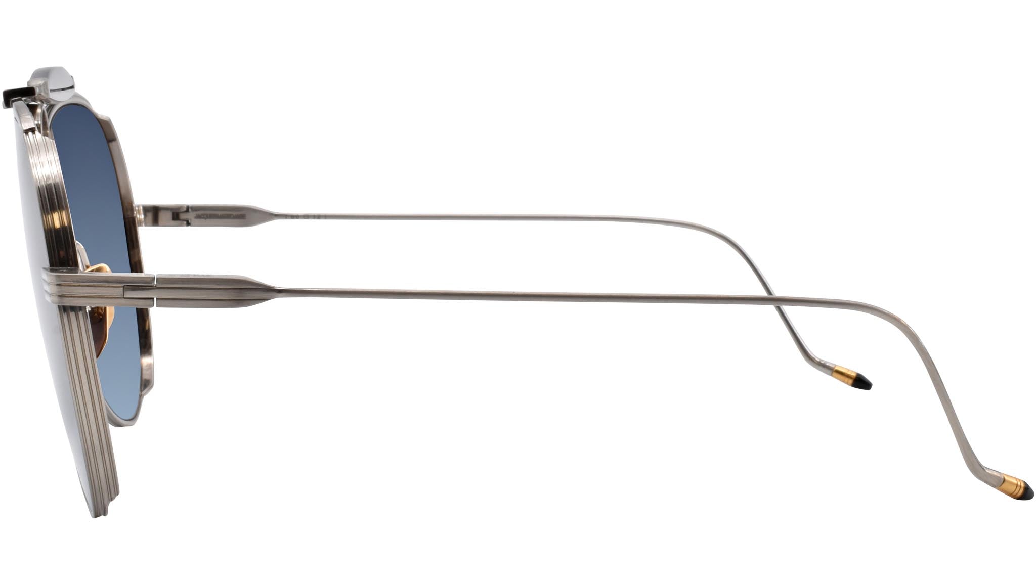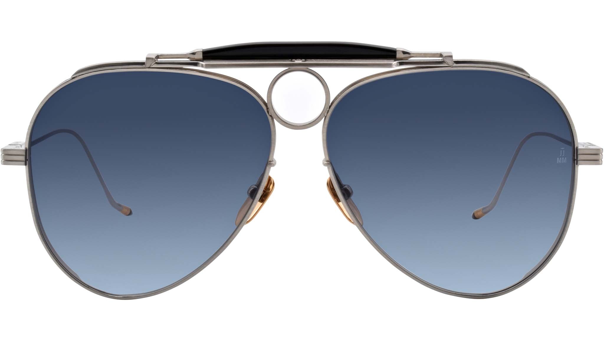 Boasting a dark gold frame entirely crafted from 100% beta titanium, the eyewear also comes with black cured cellulose acetate accents and blue gradient lenses. The eyeglasses feature a custom silver block hinge, black acetate bridge accents, and black epoxy tail-fin temple tips. Jacques Marie Mage has also incorporated custom nose pads with the brand's logo and hairline engraving. The denim gradient CR-39 lenses come with the engraved Diamond Cross Ranch logo. These aviator-shaped frames have a 2 base lens, complete with a backside anti-reflective treatment, providing 100% UV protection.