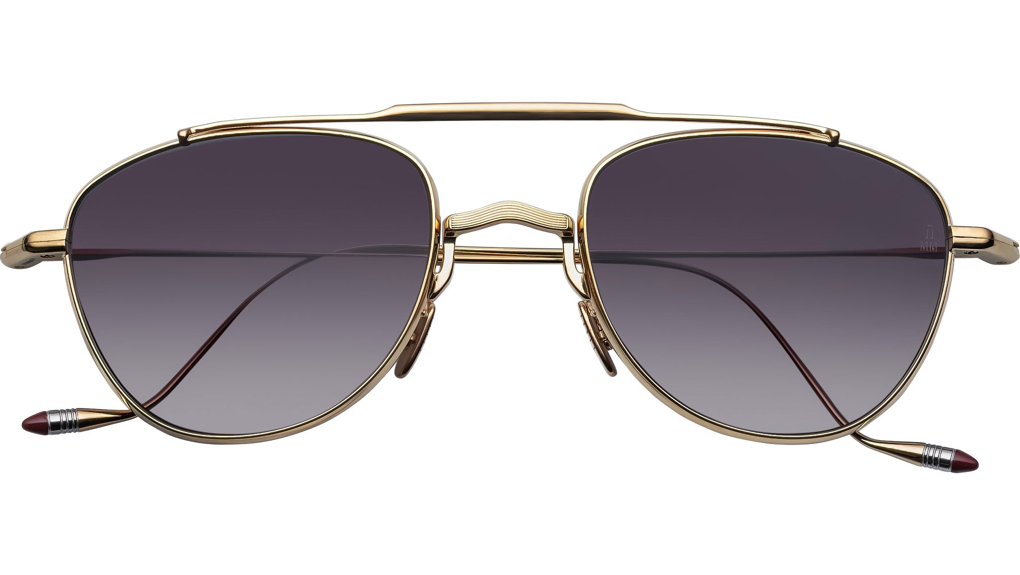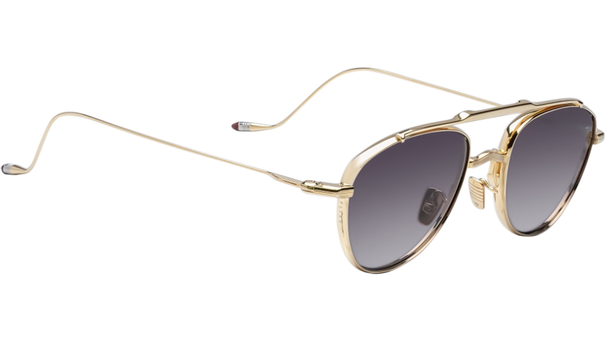 Moon gold 100% beta titanium frame paired with grey lenses. Features moon gold titanium wire temples with burgundy epoxy tips and a moon gold tension-secured custom hairline block hinge. Custom nose pads with logo and fine hairline engraving add refined detailing. Grey gradient CR-39 2 base lenses include a backside anti-reflective treatment and provide 100% UV protection. Oval shape.