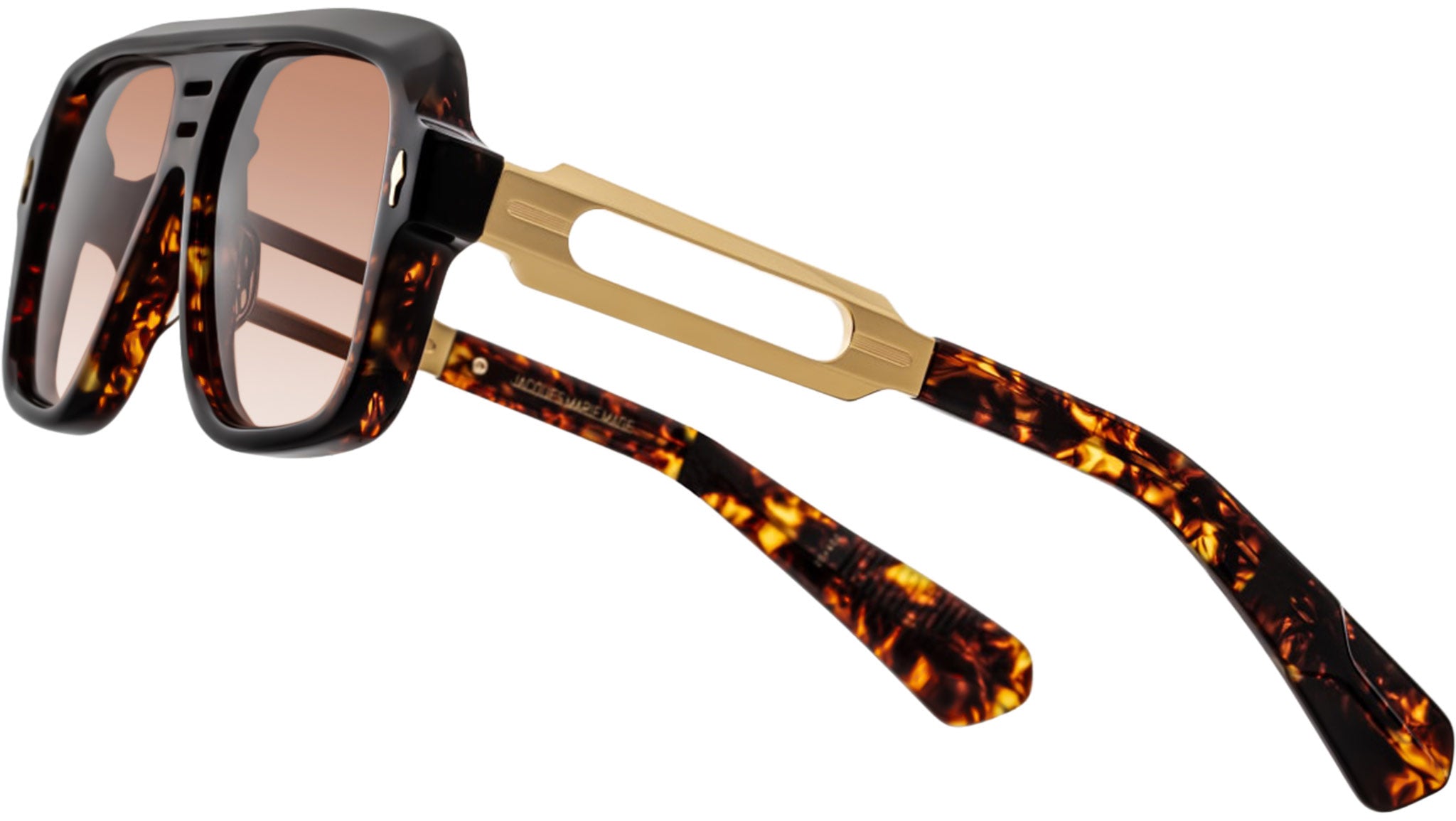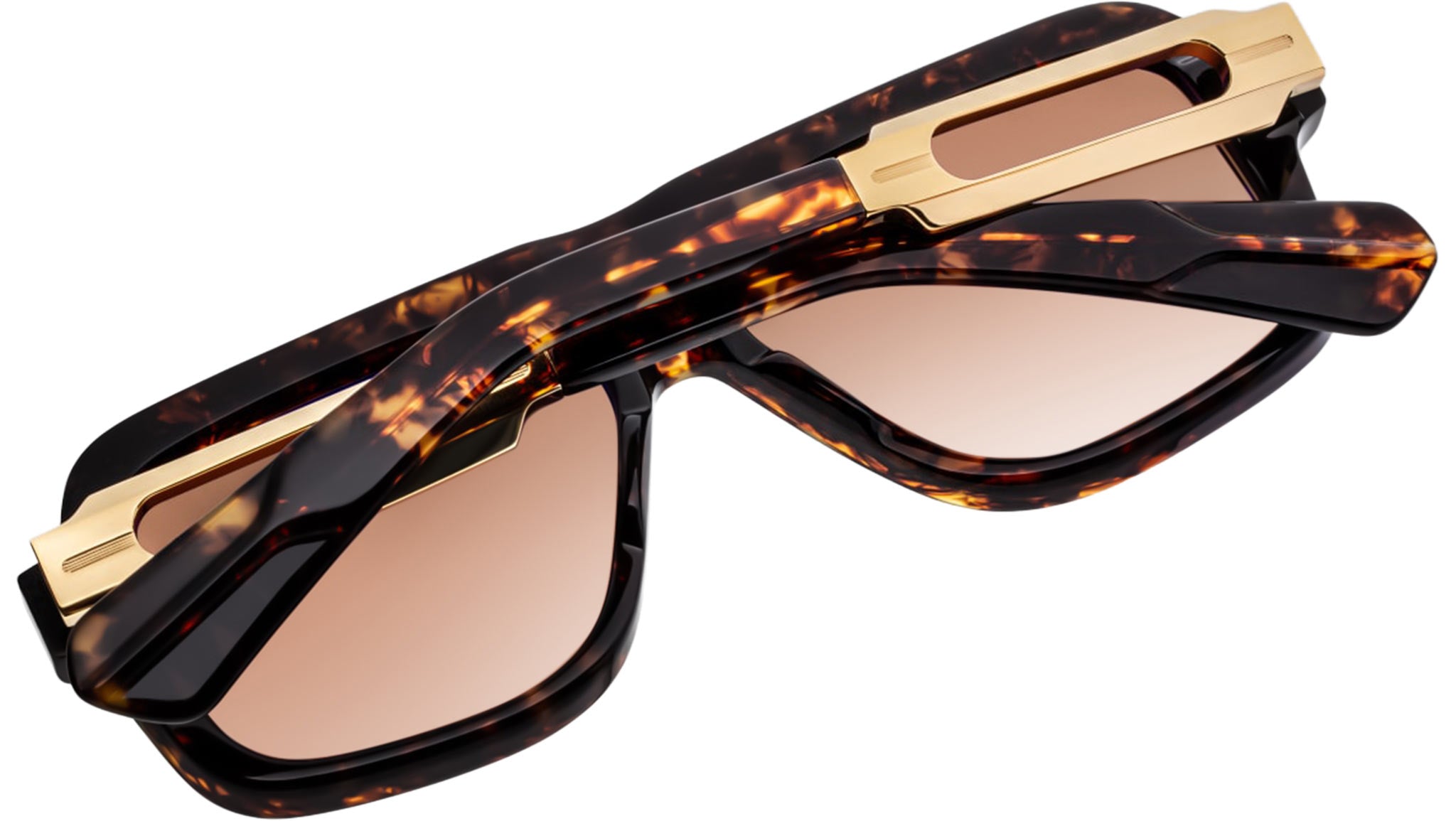 Havana 10mm cured cellulose acetate frame with moon gold 100% beta titanium temples featuring Havana cellulose acetate temple tips and brown gradient lenses. Moon gold signature arrowhead front pin. Combo temples with moon gold hardware and agar cellulose acetate. Moon gold tension-secured custom monoblock hinge. Tuscan gradient CR-39 4-base lenses with backside anti-reflective treatment. 100% UV protection.