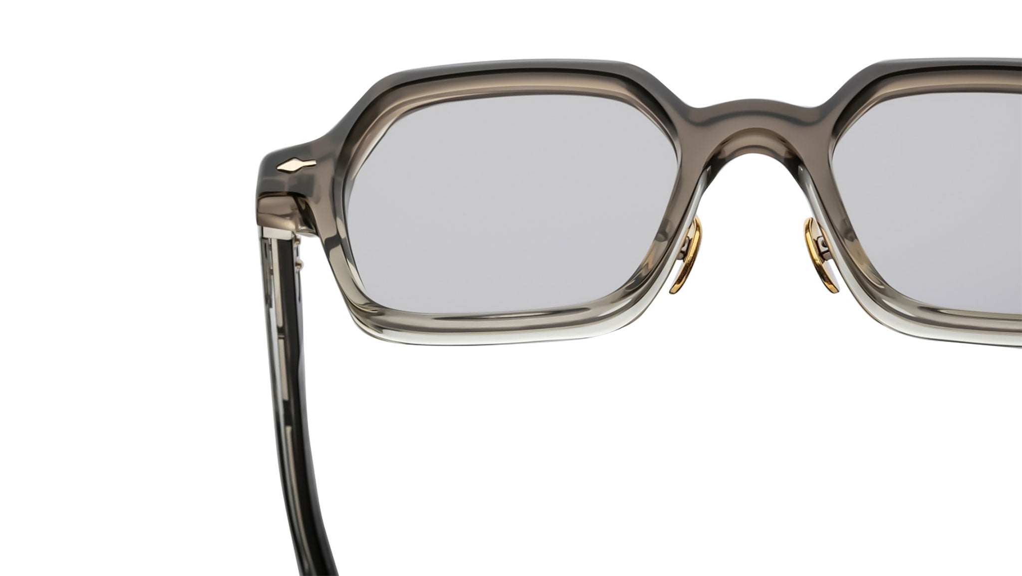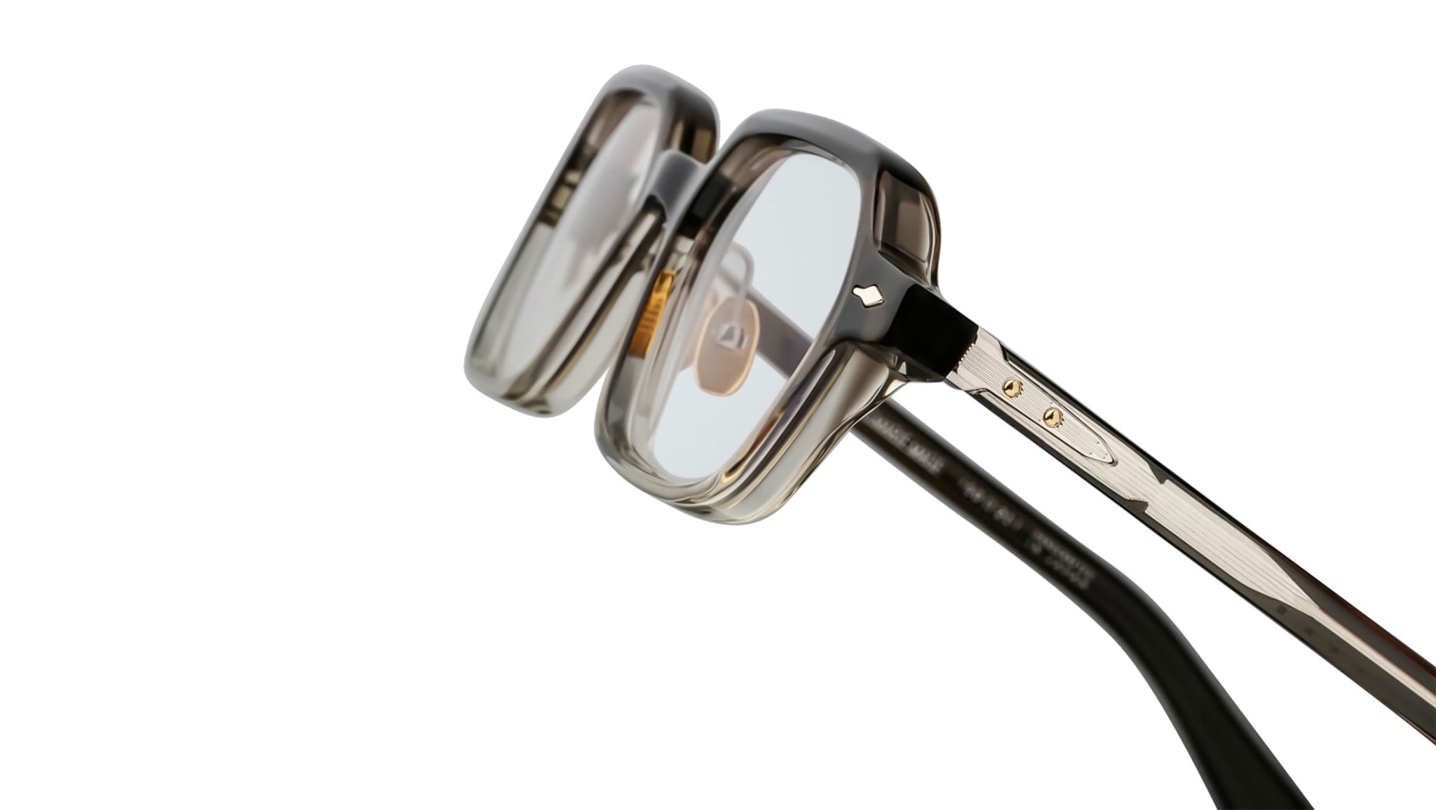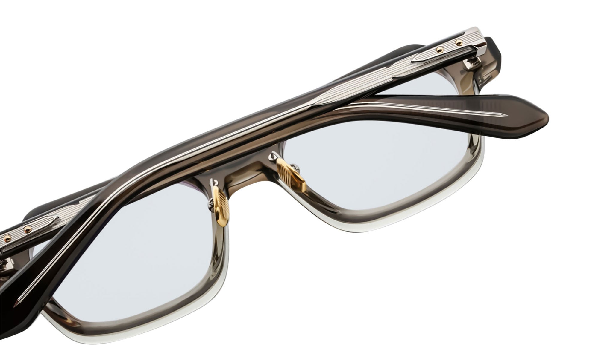 LIMITED PRODUCTION BATCH OF 350 PIECESGrey 10mm cured cellulose acetate frame with custom double-laminated acetate temples featuring precious metal hardware and demo lenses. Sterling silver signature arrowhead front pin, exposed silver blow-dart wirecore, and silver tension-secured custom monoblock hinge add sophisticated detailing. Frame shape: rectangular. Provides 100% UV protection.