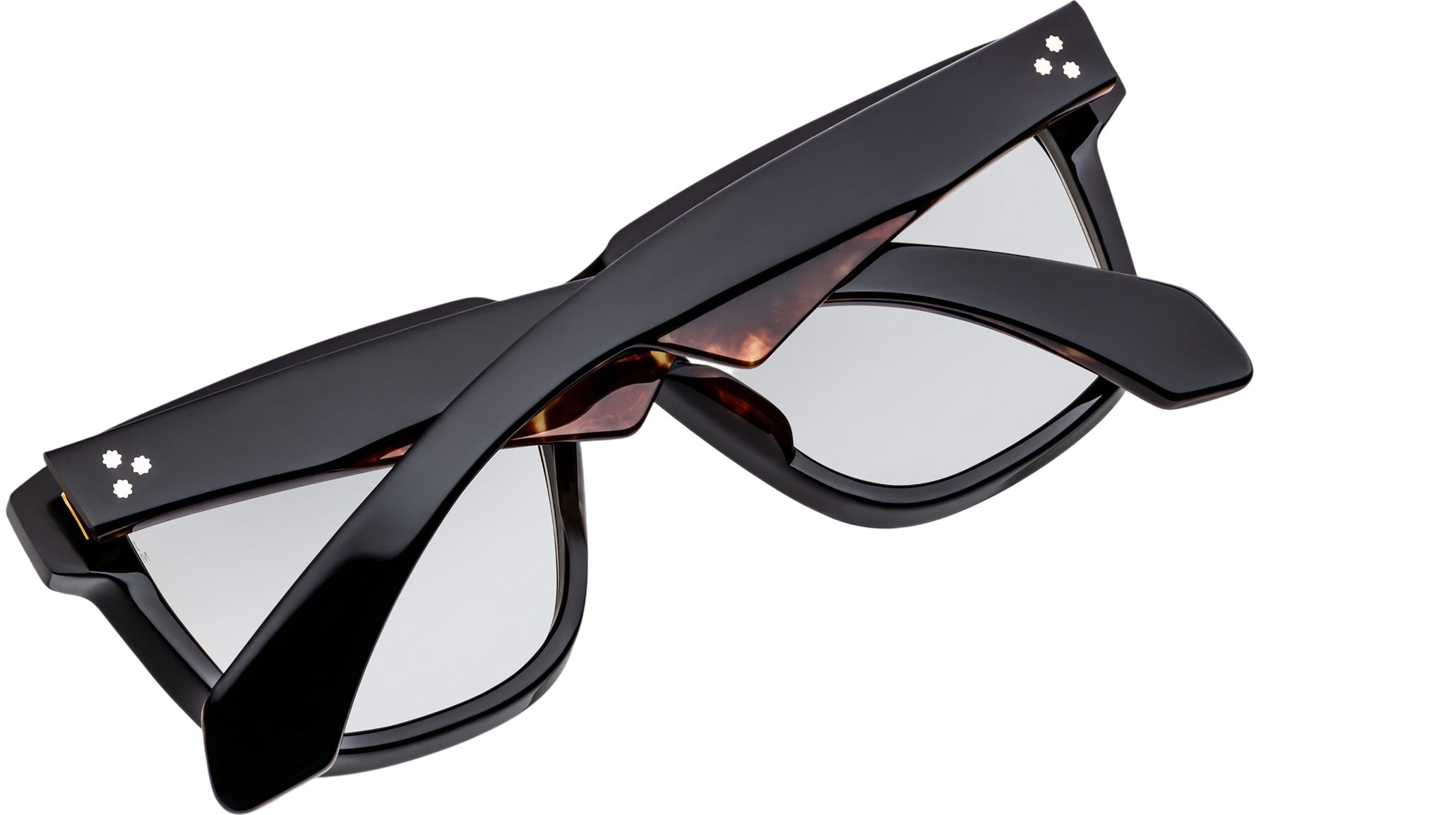 10mm cured cellulose acetate frame in black with temples composed of black exteriors and Havana interiors, complemented by Armorlite 6-base lenses in superlight bronze with backside anti-reflective treatment, signature arrowhead front pins in 18k gold, hidden Classic wirecores plated in dark gold, custom 7-barrel hinges with refined hairline details plated in dark gold, spur-shaped rivets plated in 10k gold, inner-temple hallmarks foil-stamped in gold.
